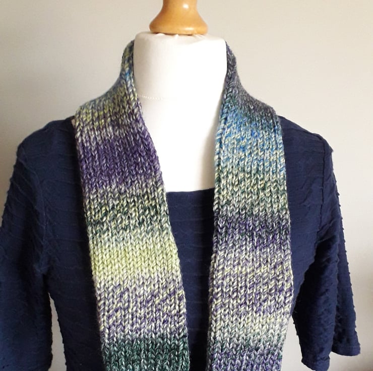 This infinity scarf has been knitted from beautifully soft acrylic yarn in wonderful rich shades of purple, green and blue which blend to create a marbled effect. It is double thickness to keep you really warm and cosy.