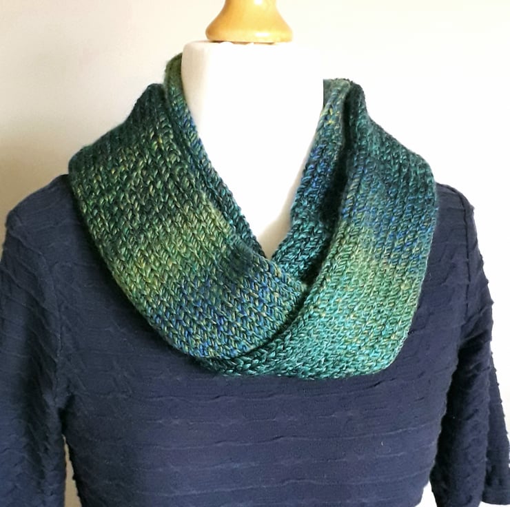 This infinity scarf has been knitted from beautifully soft acrylic yarn in rich shades of turquoise, blue and green, which blend to create a marbled effect. It is double thickness to keep you really warm and cosy.