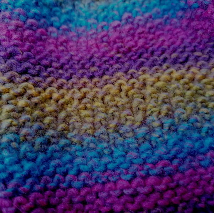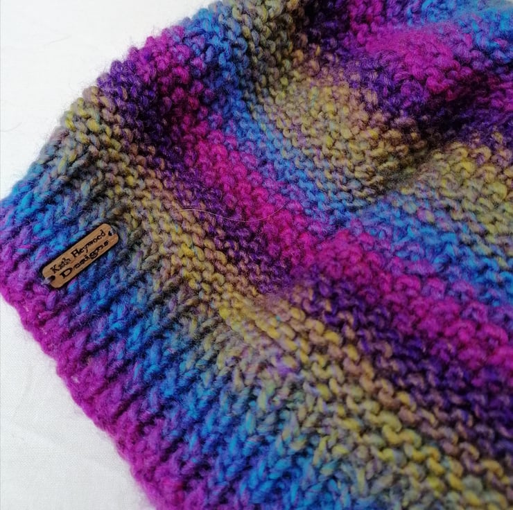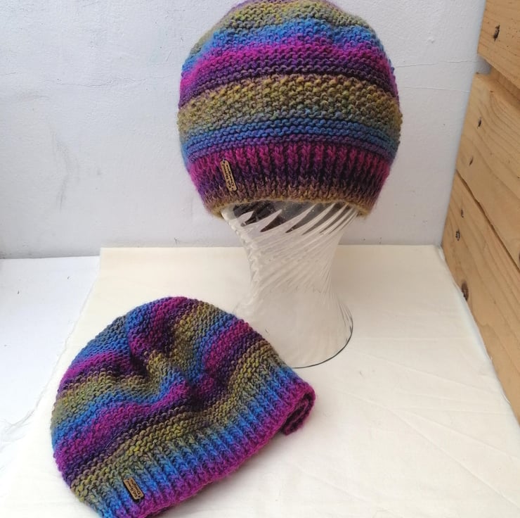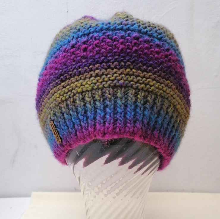 Cosy and soft, adult, hand knit beanie hat in a lovely multicoloured soft yarn with a slight brushed feel. Hand knitted using garter and moss stitches to give an interesting texture.