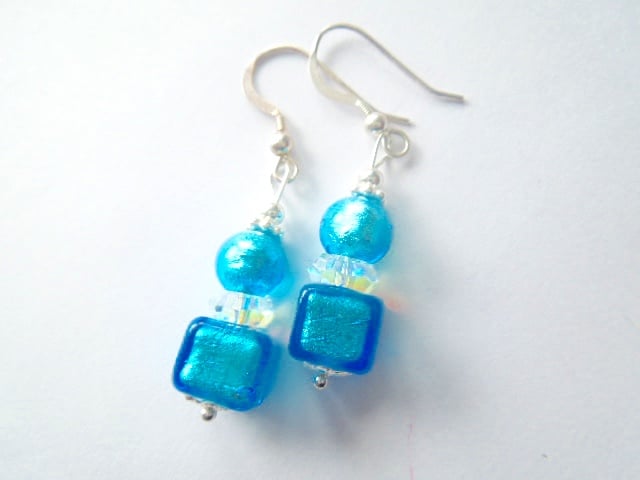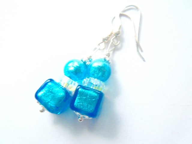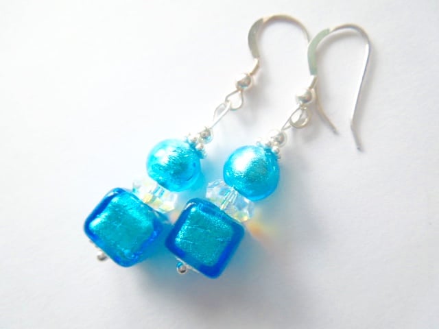 A gorgeous pair of handmade Murano glass earrings with 24k white gold foiled turquoise Murano glass cubes (10mm) and 24k white gold foiled turquoise Murano glass round beads with sparkly Swarovski crystal rondelle beads. These richly coloured beads are enhanced by sterling silver spacer and round beads. The earrings hang from sterling silver ear wires and measure 25mm in length excluding wires. They are presented in an organza gift bag.