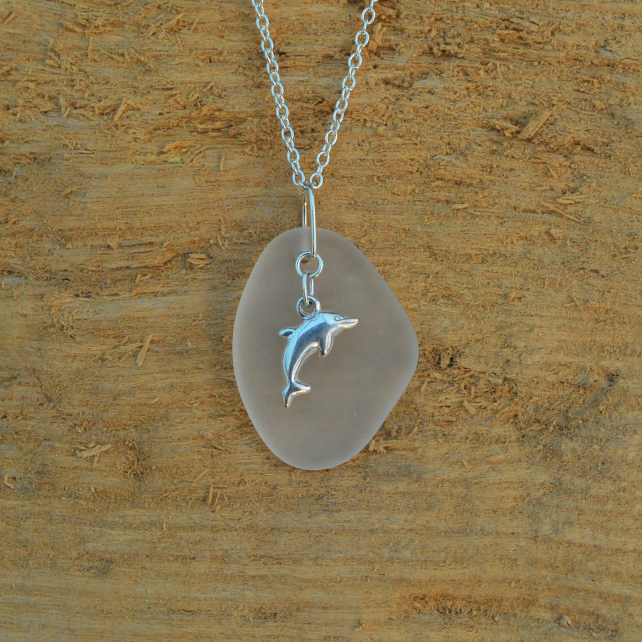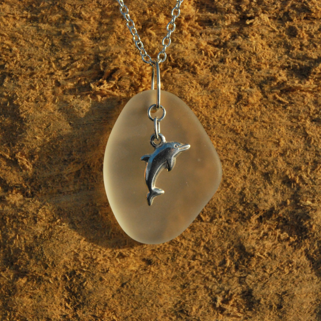 This pretty pendant has been made from a beautifully shaped piece of beach glass and a silver dolphin which fits the shape of the glass perfectly. The glass has come from an old bottle so it curves gently behind the dolphin. We have tumbled the glass so it is silky smooth.