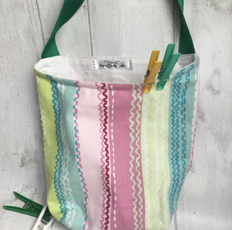 Are your pegs always in the wrong place on the line when you’re hanging out your washing? Do you suffer with back problems and need to avoid lots of bending? This fantastic over-the-shoulder peg bag may solve all your problems. Pop the bag on before you head into the garden and your hands will be free to hold laundry while your pegs will always be right at your fingertips! This bag is made from a pretty, pastel-striped cotton fabric, has a plain white lining and a green strap. It measures approximately 24 x 29cm and will hold at least 50 clothes pegs. The strap is a strong, webbing, measuring approx. 120cm long. The front of the bag is held open at the top by the insertion of a length of lightweight boning, meaning that it doesn’t sag and your don’t have to fumble to find the pegs.
