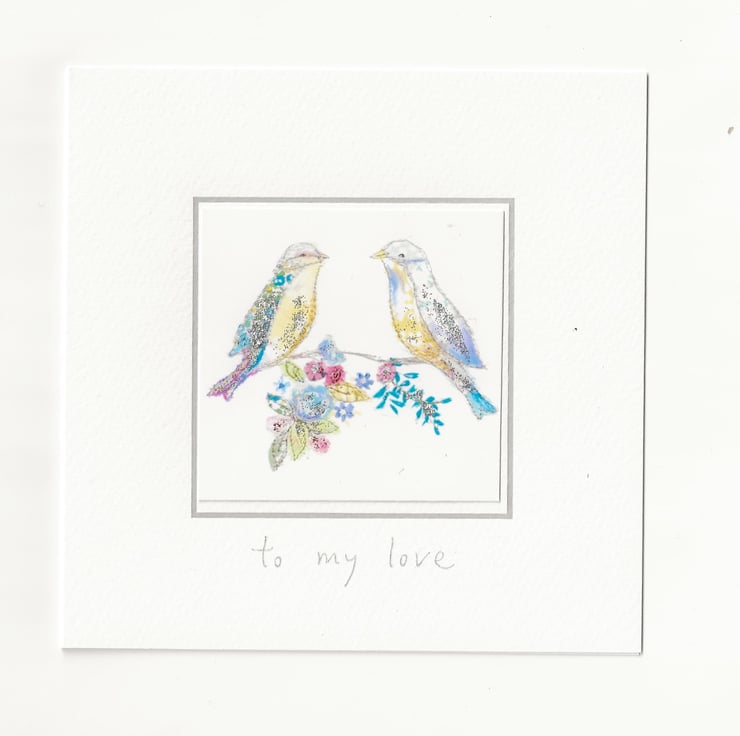 A beautiful handmade card with two love birds sitting on a branch, designed and created by the artist Suzanne Hooson, using delicate fabrics and free machine embroidery, printed and hand finished with glitter to add an extra sparkle.