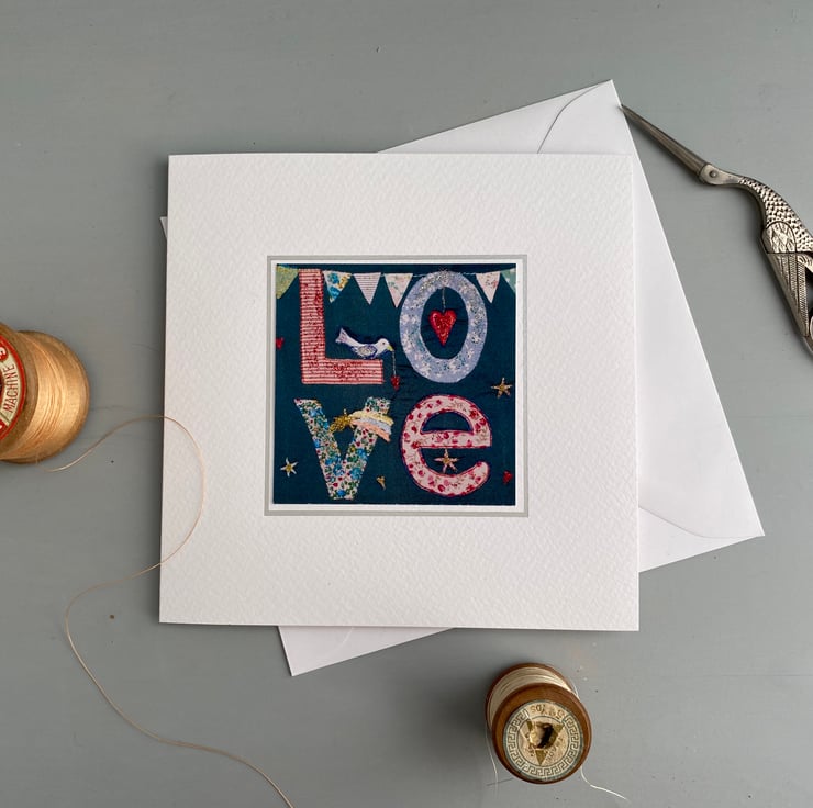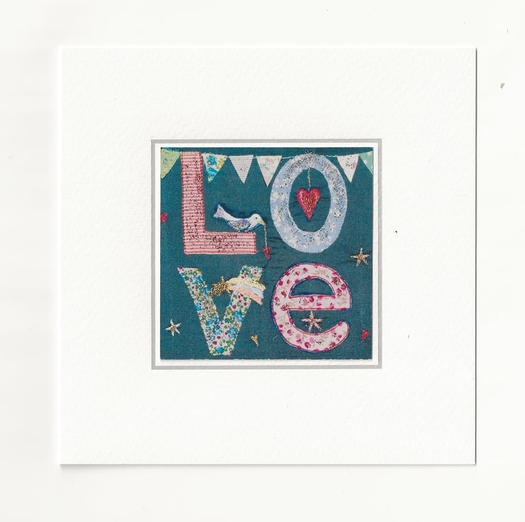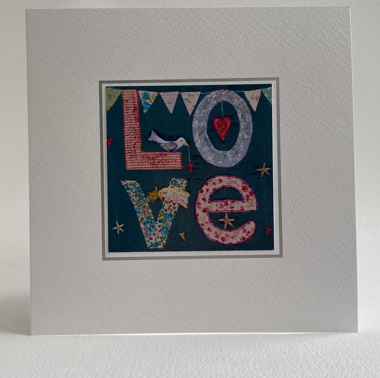 handmade greetings card, designed and created by the artist Suzanne Hooson, using beautiful layered fabrics and free machine embroidery, printed and hand finished with glitter for an extra sparkle.