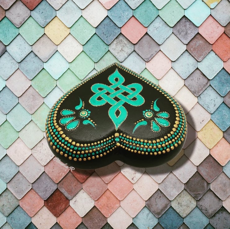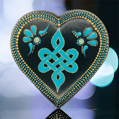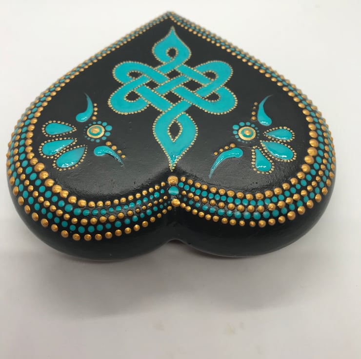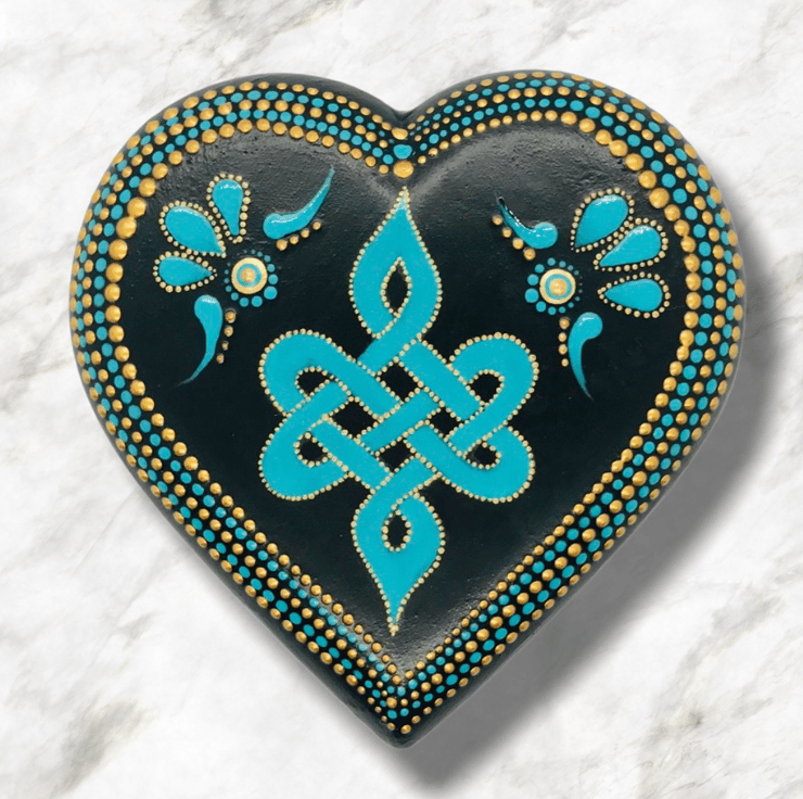 I love the symmetry of this design and really enjoyed painting it onto this heart and embellishing it with my own styling. Apparently the “Endless Knot” appeared on clay tablets in 2500 BC. and this ancient design is found in Chinese, Tibetan, Mongolian, Indian and Celtic symbolism and probably appears in other cultures too. It is a complete loop with no beginning or end, representing eternity, whether this means loyalty, faith, friendship or love. It is one of the 8 auspicious symbols, associated with Buddhism, Jainism and Hinduism and is said to bring good fortune.