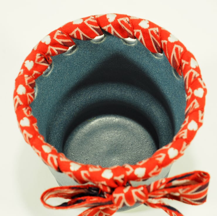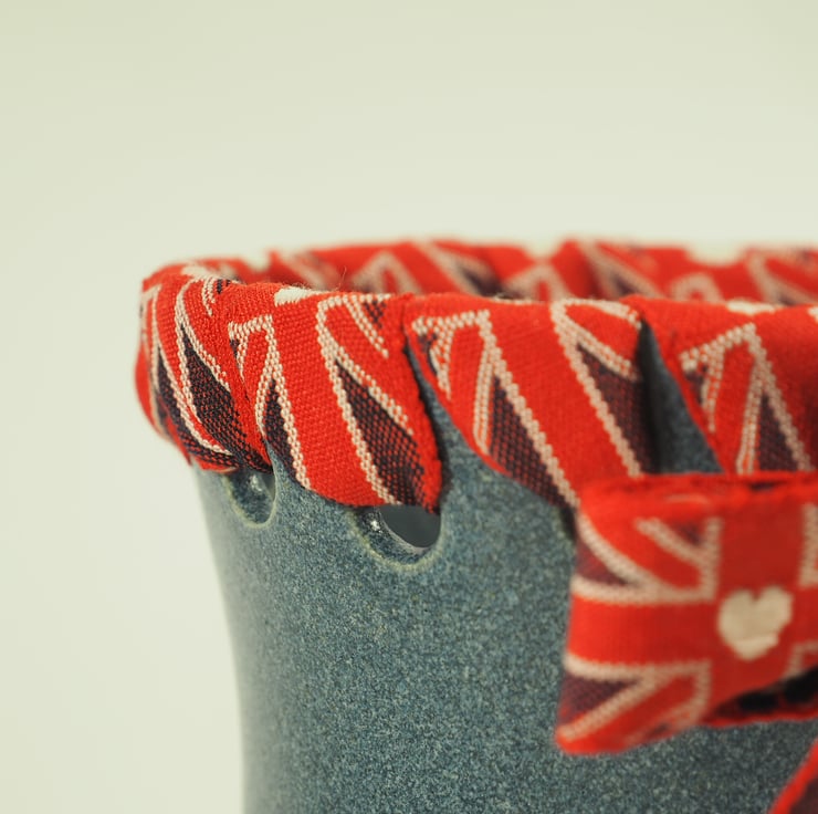 A decorative ceramic blue cup or beaker with a perforated rim, finished with a colourful Union Jack ribbon with small hearts. The ribbon is threaded over the rim and to give a fabric covered edge and finished in a bow at the front.