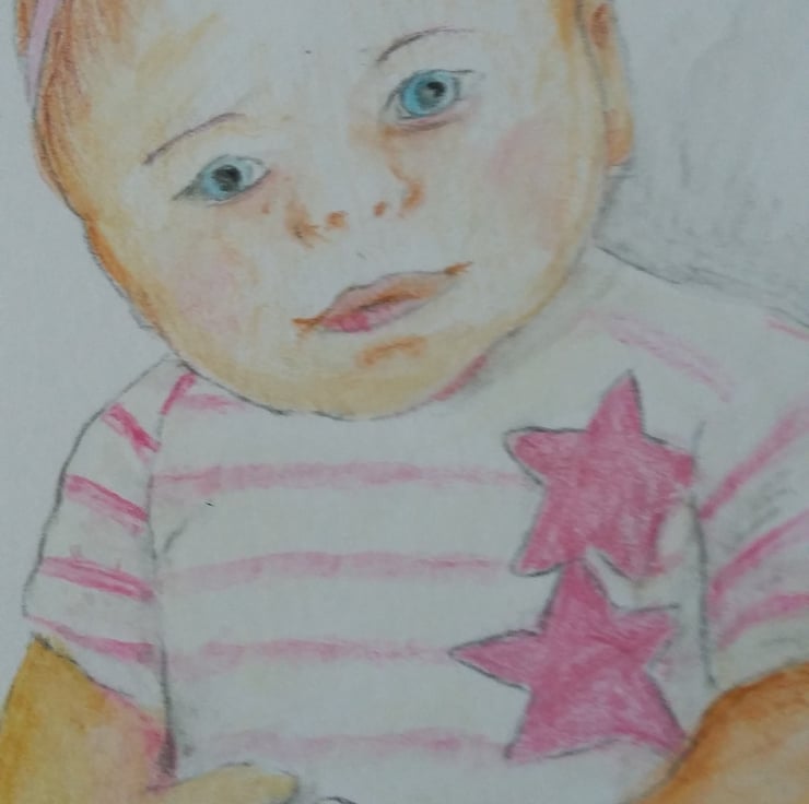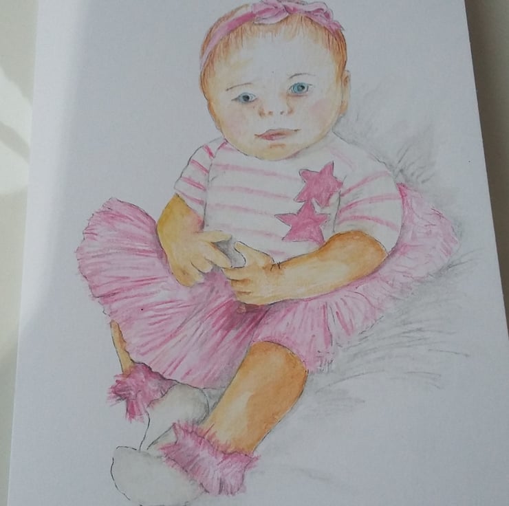 A 5 X 7 WHITE CARD WITH A BABY GIRL DRESSED ALL IN PINK