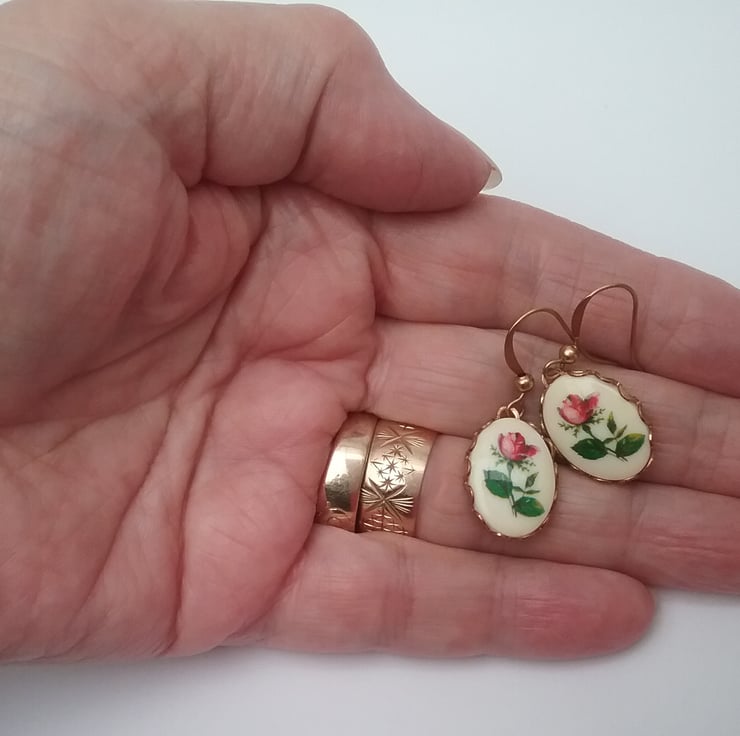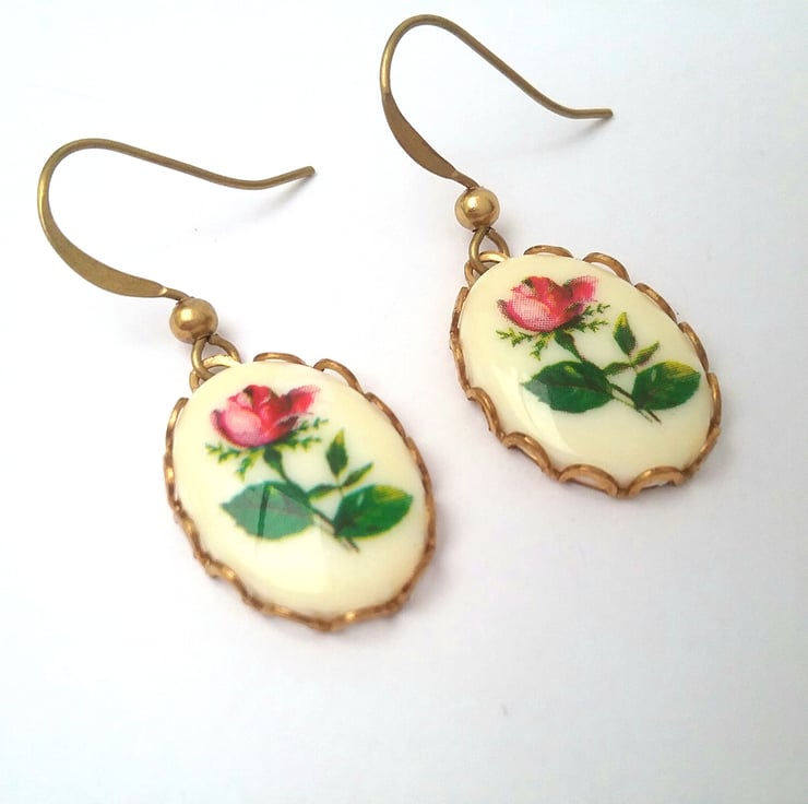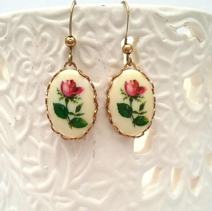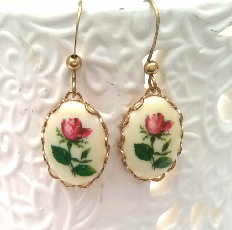 Vintage dainty floral cabochon earrings set into brass scallop edge settings