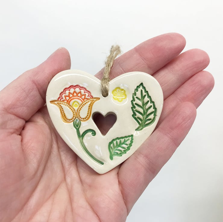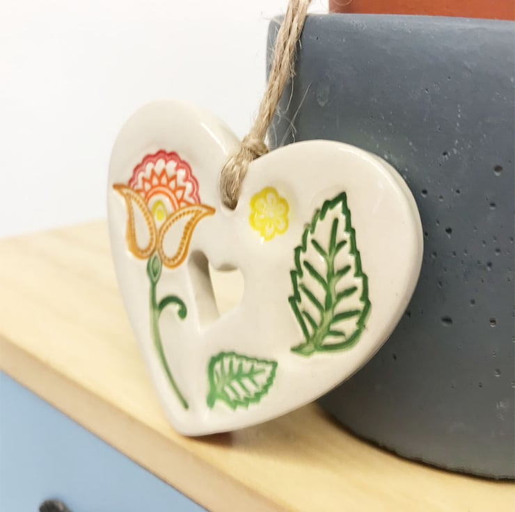 This little ceramic heart decoration is made from white earthenware clay and decorated with a little flower and leaf print It has been fired twice and finished with a glossy glaze for a lovely smooth finish. It measures 6cm x 5.5cm and hangs from rustic brown string