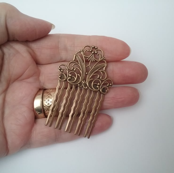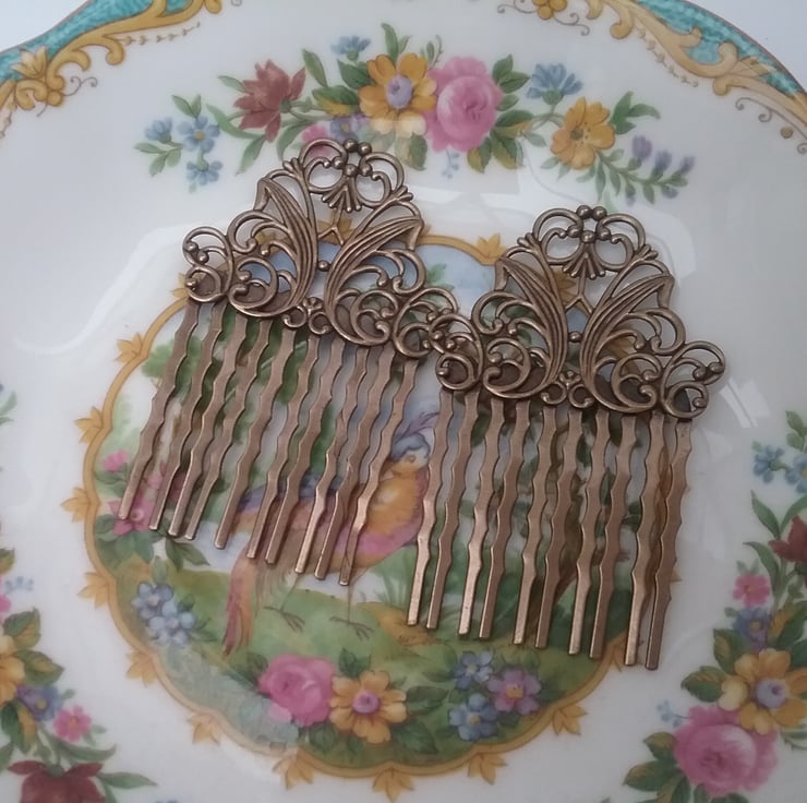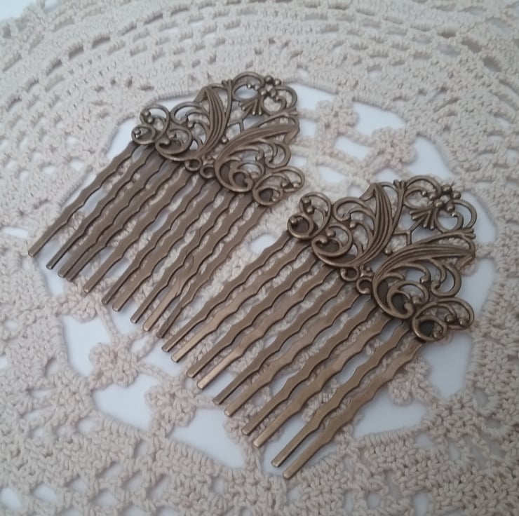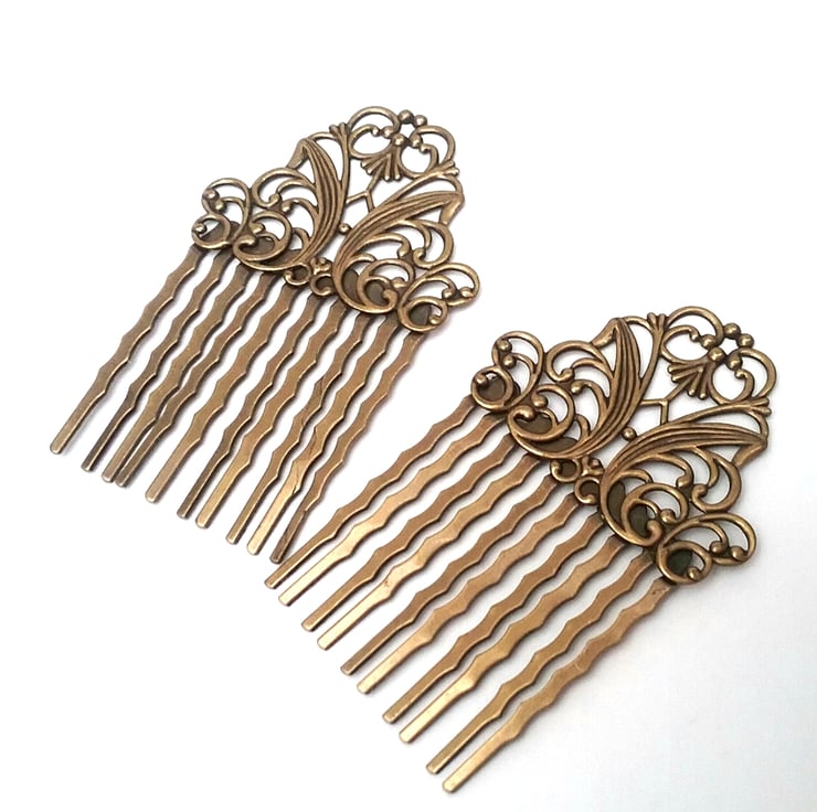 Set of two brass ornate filigree hair combs