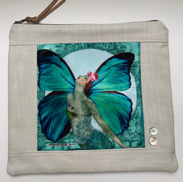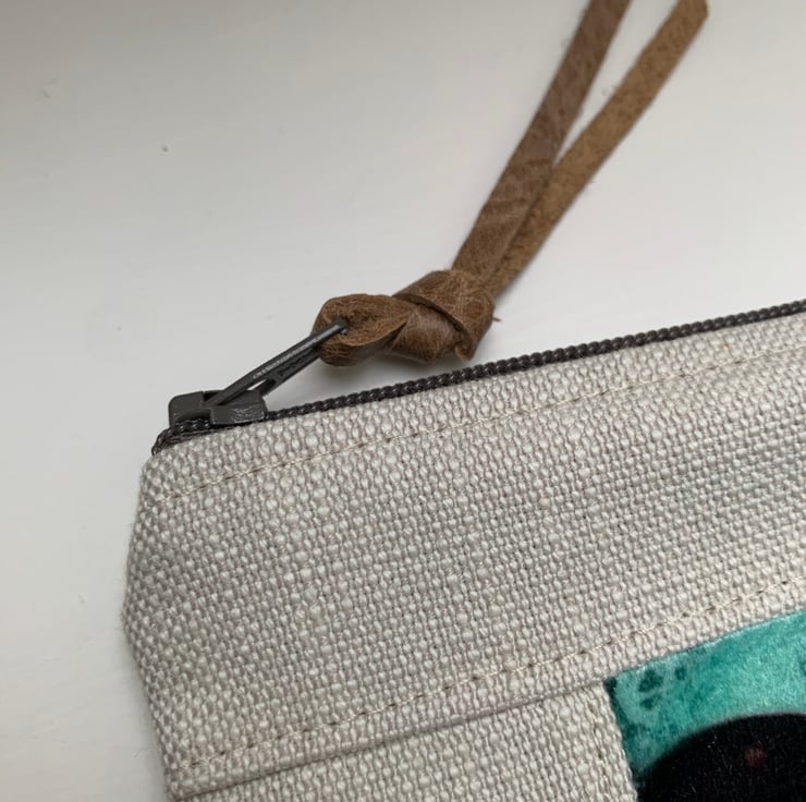 Beautiful one of a kind zip pouch with a colourful velvet panel framed with linen.