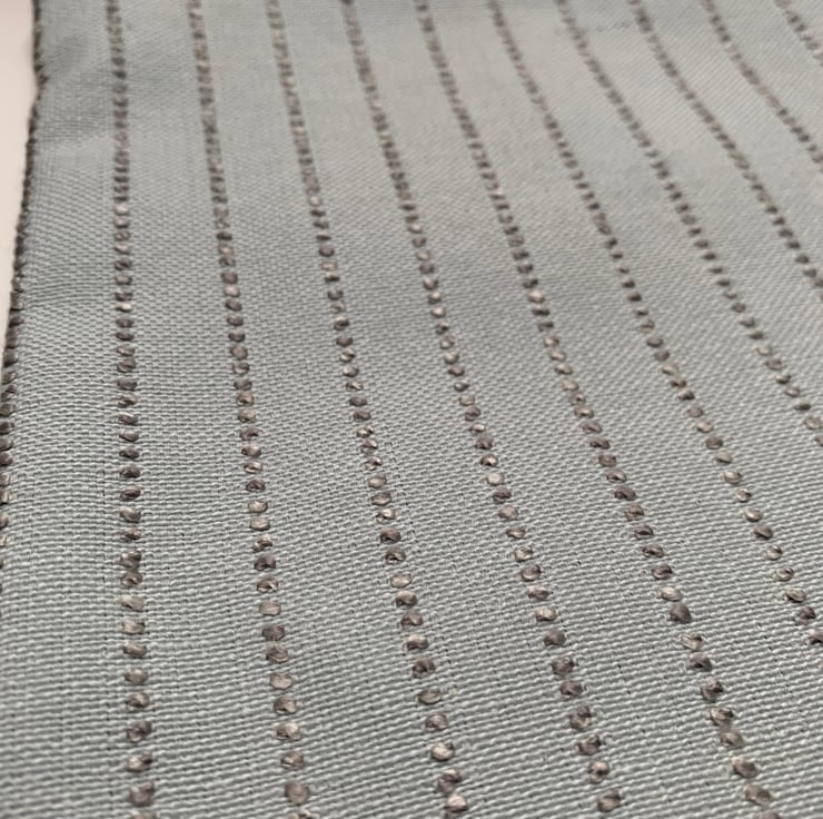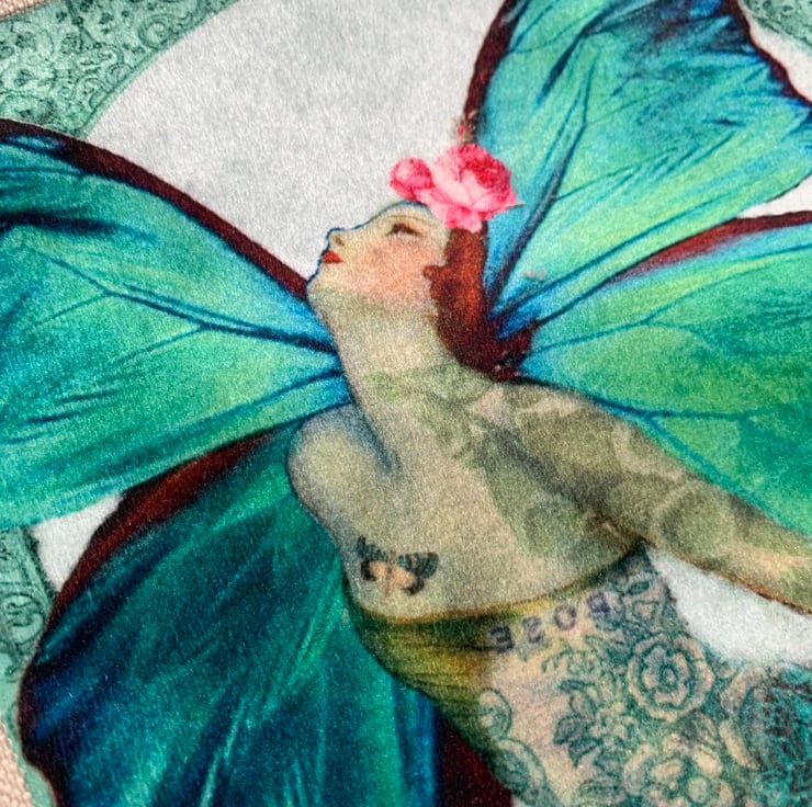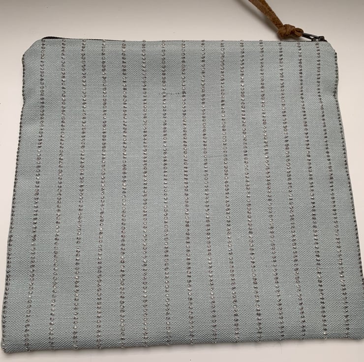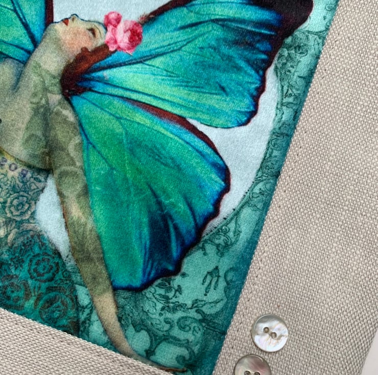 This velvet, designed by Marianne Ley, is wonderfully vibrant with rich shades of green and blue. I have combined it with beige linen and backed it with a pale blue fabric with a raised chenille pinstripe. It is trimmed with 2 mother of pearl buttons.