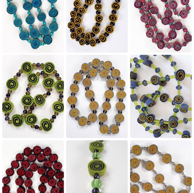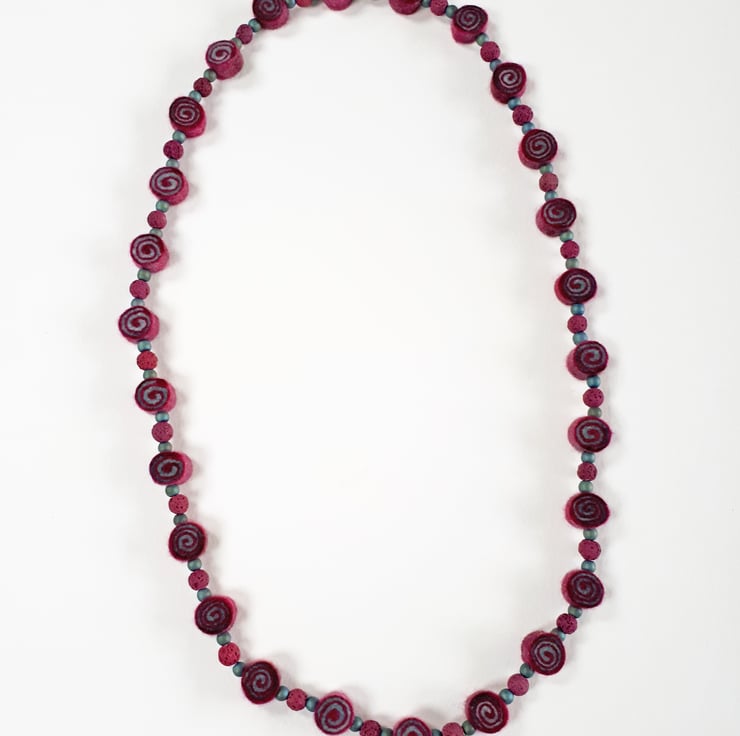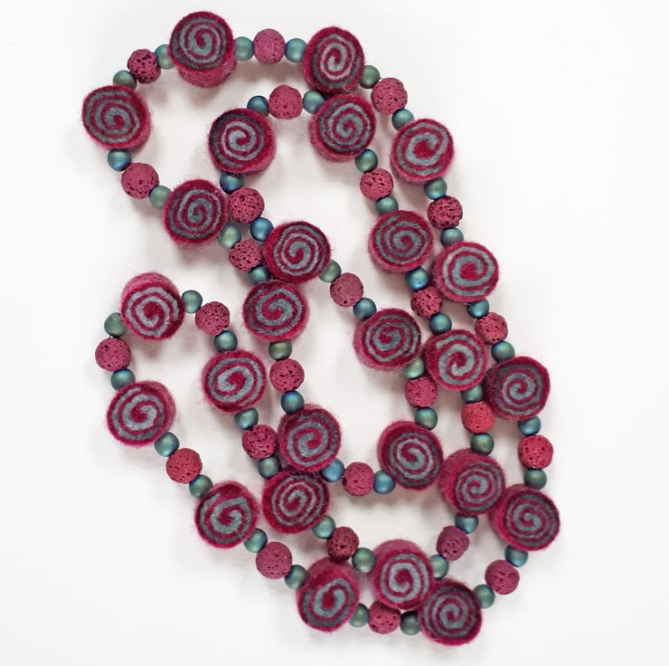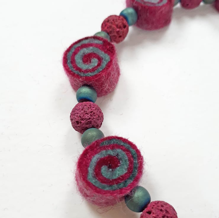 I make the felt beads in colour combinations that I like and then combine them with other beads to complete the necklace. The colours in the felt beads spiral round each other. Here I have used haematite and lava beads in colours that match the felt beads. The haematite beads have a metallic sheen and the lava has a honeycomb texture which complement the soft, matt nature of the felt. The necklace is strung on elastic cord.