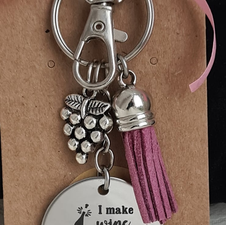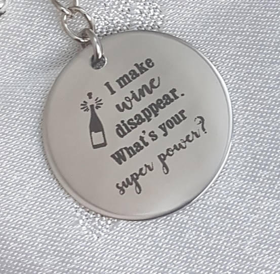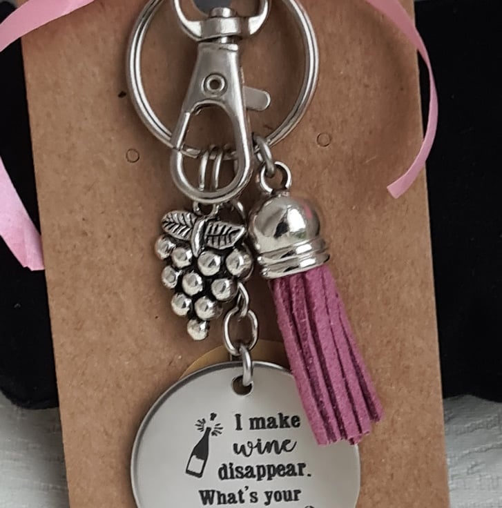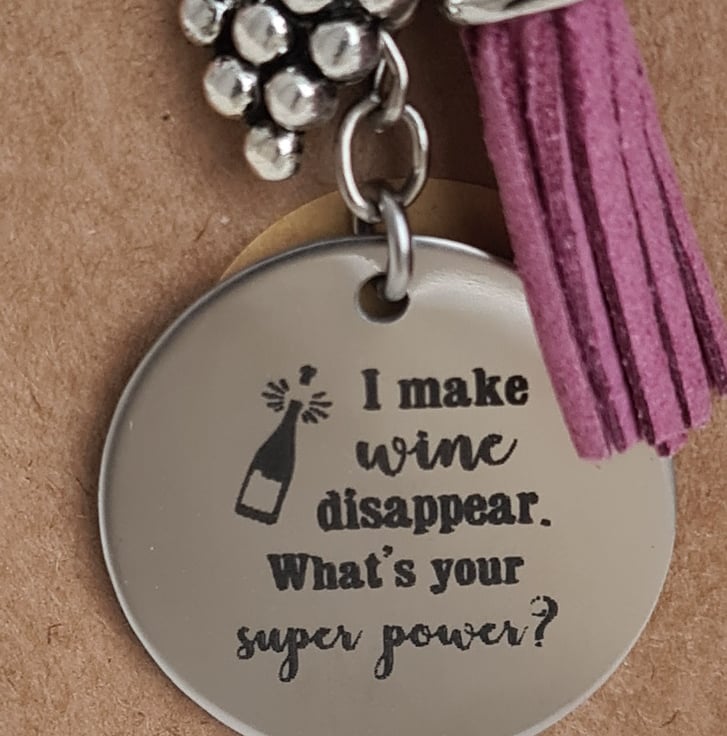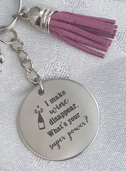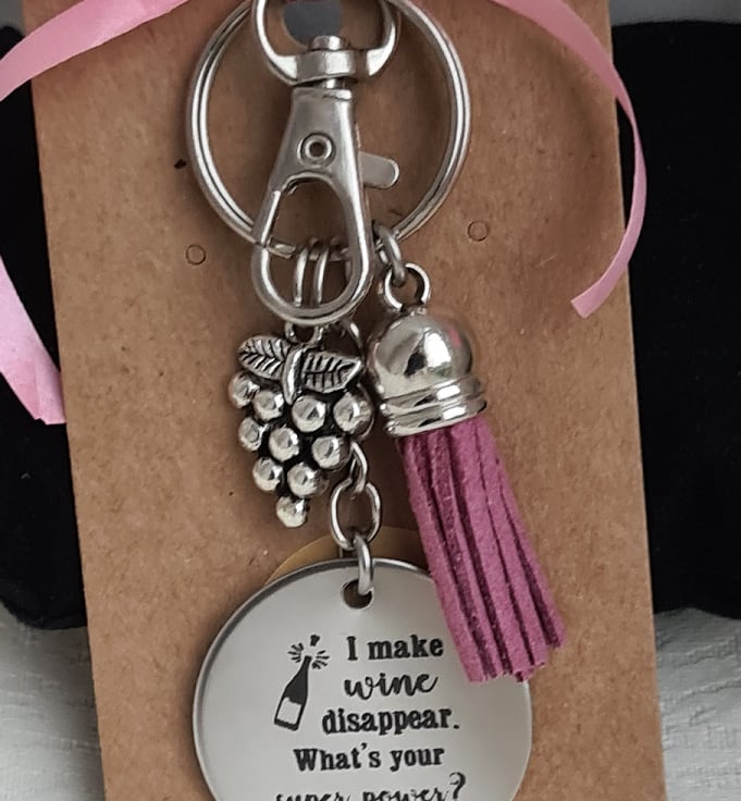 Fabulous Wine Lovers key ring with a Stainless steel engraved disc with the slogan I Make Wine Disappear. What's Your Super Power? A lovely bunch of grapes charm and a gorgeous Amethyst colour leather tassel.