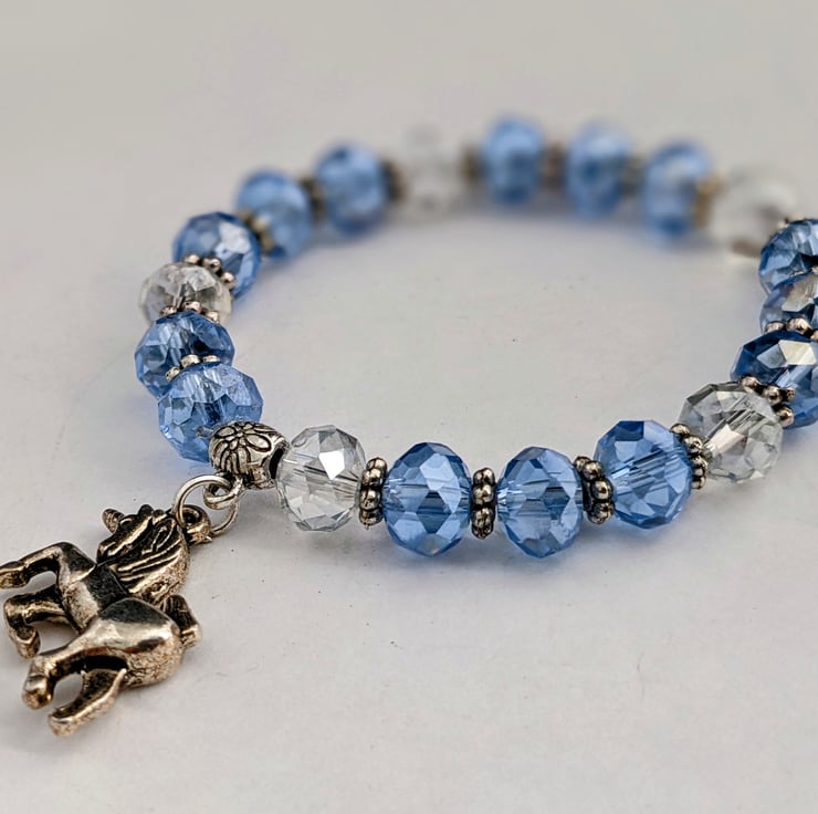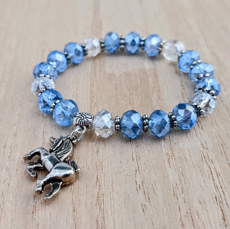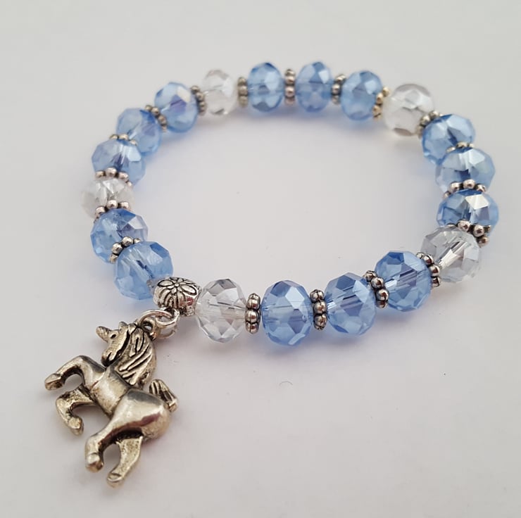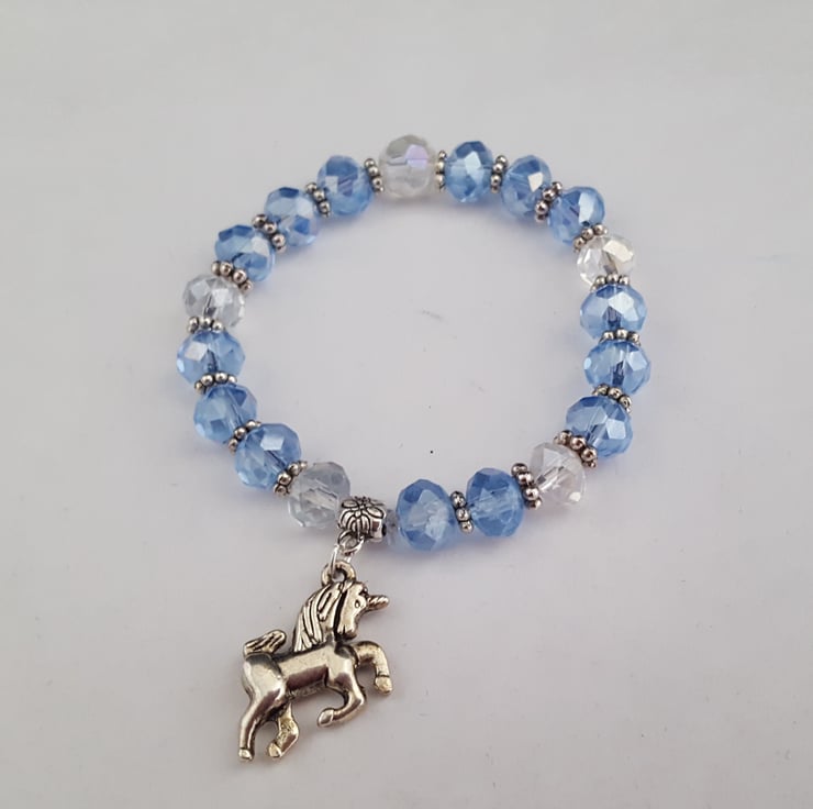Child's 6" stretch bracelet of 8mm pale blue and clear faceted glass beads with Tibetan silver spacers and 15mm double sided Tibetan silver unicorn charm. In an organza gift bag.