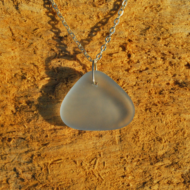 Very occasionally we find a colour of glass on the beach which we've never seen before. This pendant is one of those, and it is a wonderful shape as well. It is thicker at the top and slightly curved, so we think is has come from a glass dish. We have tumbled the glass so it is perfectly rounded and smooth. The fine frosting gives the glass a magical sheen which looks lovely with the sterling silver we have used to mount the pendant.