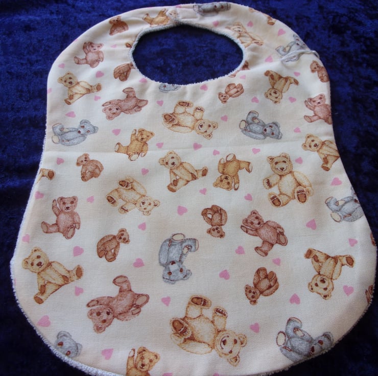 The design features teddy bears and pink hearts on cream background. The neck fastening is Velcro so it is easy to put on and take off before and after feeding baby.