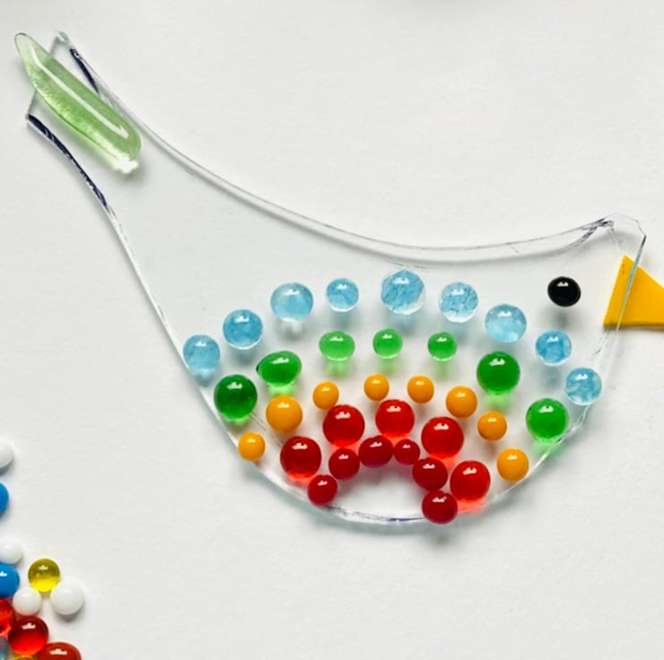 What a wonderful thing to try at home !! This beaded bird can be decorated in your own style . Strong adhesive glue , a selection of coloured pre fused glass beads and beak and eye all included with instructions . Once you have designed your bird, simply wrap it in wrapping and box it comes in and return to me to be fired in my kiln . . They wait for the post man to deliver your very own designer bird !