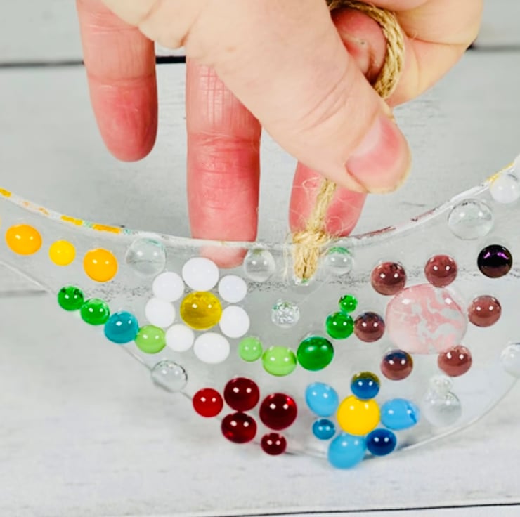 The make at home kit contains 2 hearts , fused glass beads and glue . Simply design it and send it back to me for fusing and I then post it back to you . You can decide to have a full fuse (smooth) or contoured finish. The hearts will be drilled and supplied with jute for you to hand.