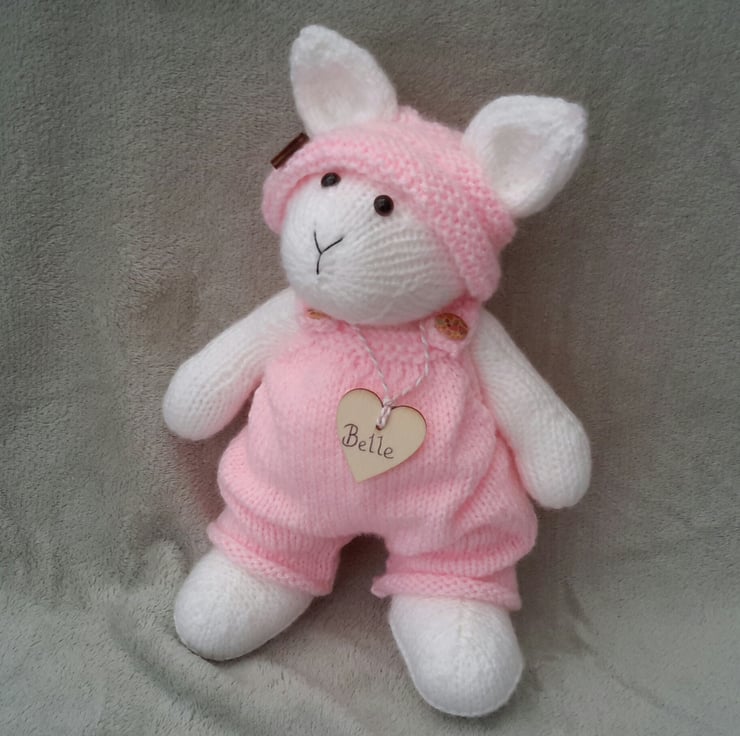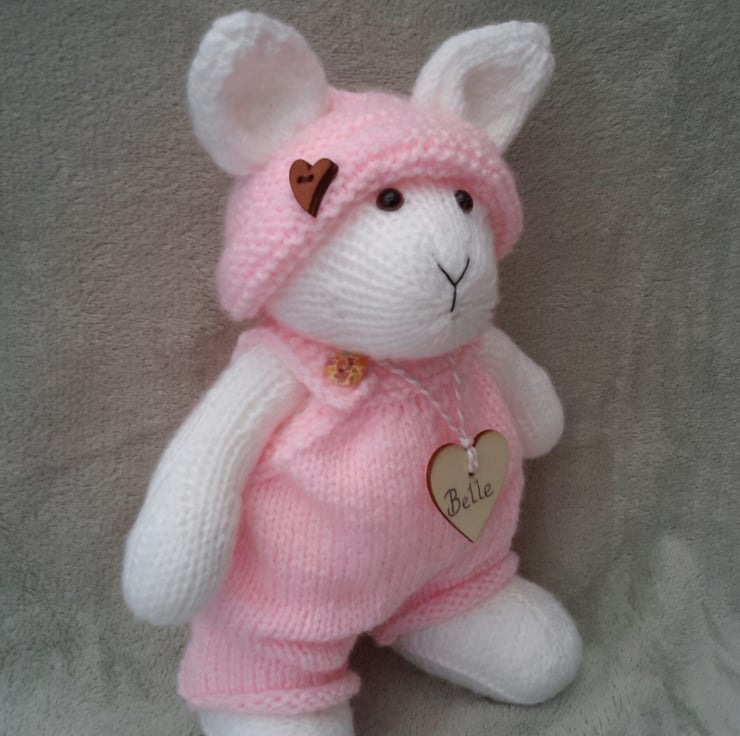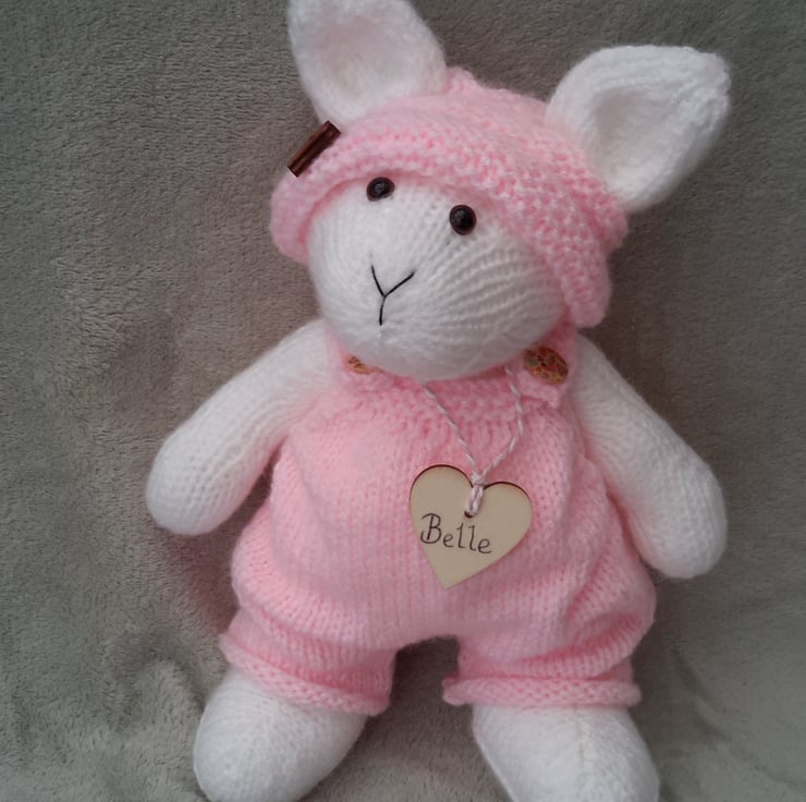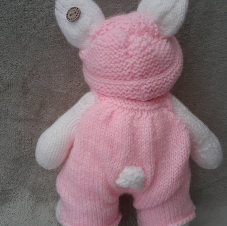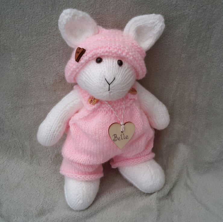 Made to customers colour request, Belle is a completely white bunny and wears baby pink hand knitted dungarees and matching hat from James Brett baby dk yarn.