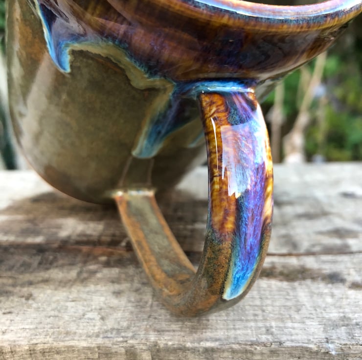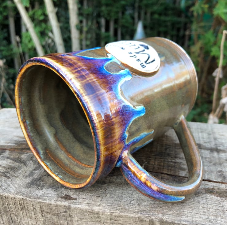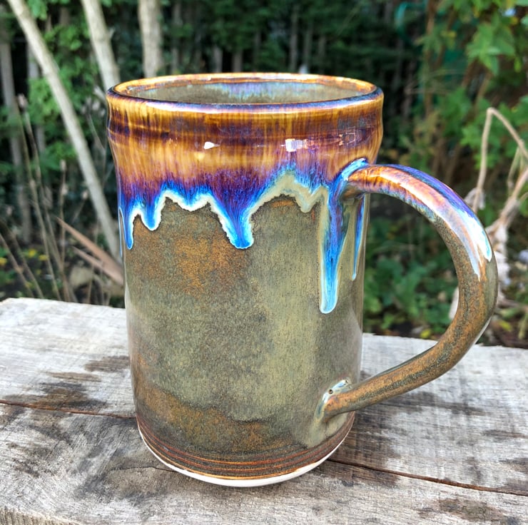 A stunning MadeWithMud stoneware wheel thrown tankard. Featuring stunning unique vivid drips of colour.