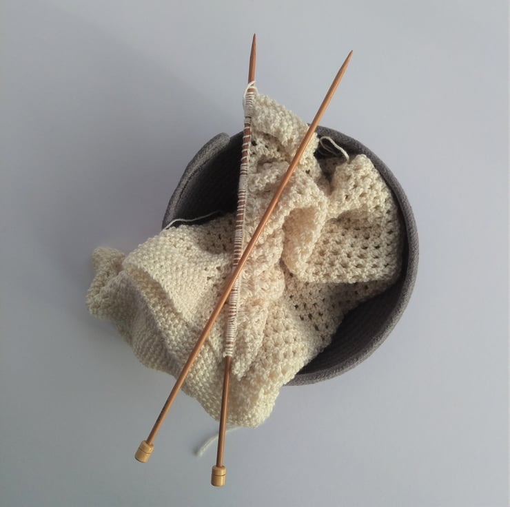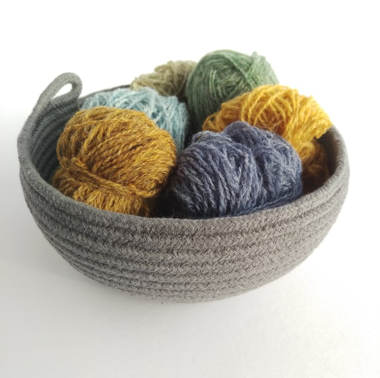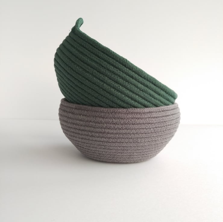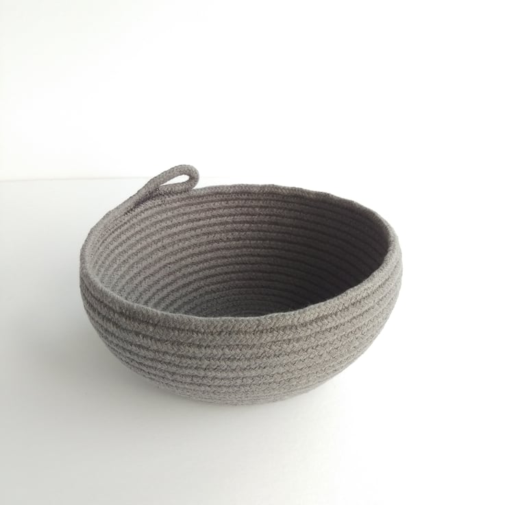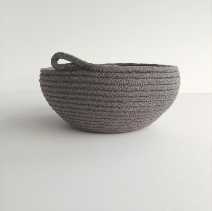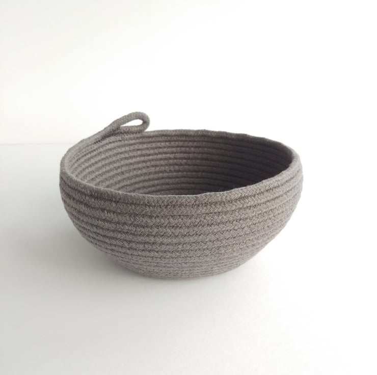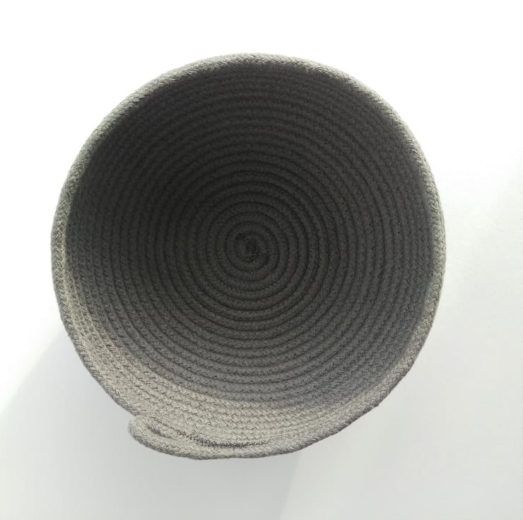 An ideal size for a scarf or hat project this Bouldner bowl has been formed on my sewing machine from a continuous coil of dark grey 100% cotton rope.