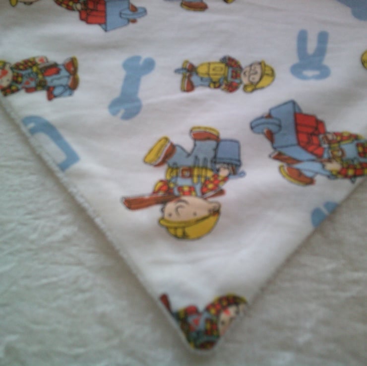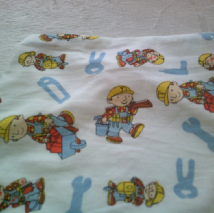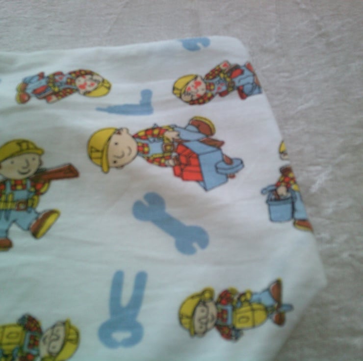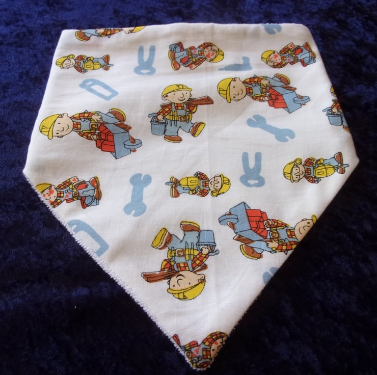The fabric used for this dribble bib is of Bob The Builder with wheelbarrows of bricks, carrying planks of wood and tools on a white background.
