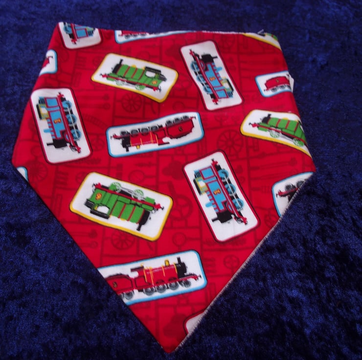 The fabric used for this dribble bib is of Thomas the Tank engine and friends on a red background.
