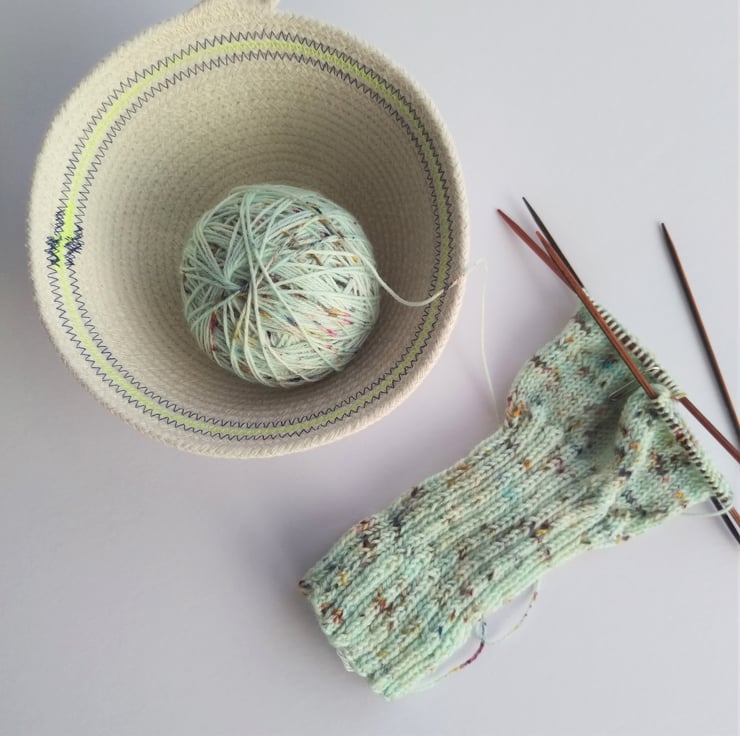 At around 5 1/2" across and 2 1/2" high this little bowl is a great size for keeping notions in or holding bobbins and thread by the sewing machine.