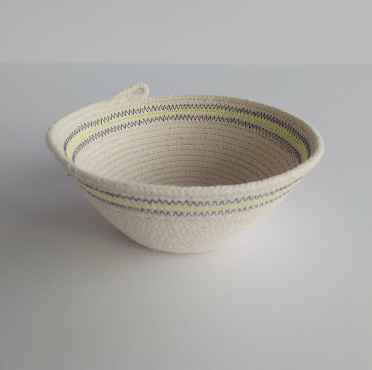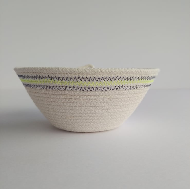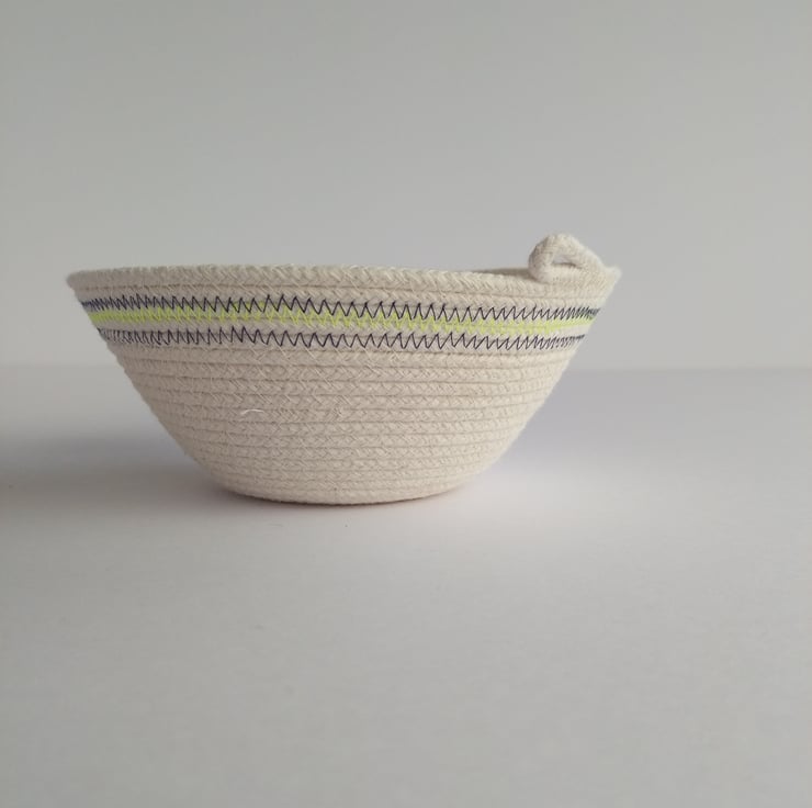A spiral of unbleached cotton rope has been machine stitched to form this simple and elegant Freshwater Bowl, which has been finished with a band of colour in navy and neon yellow