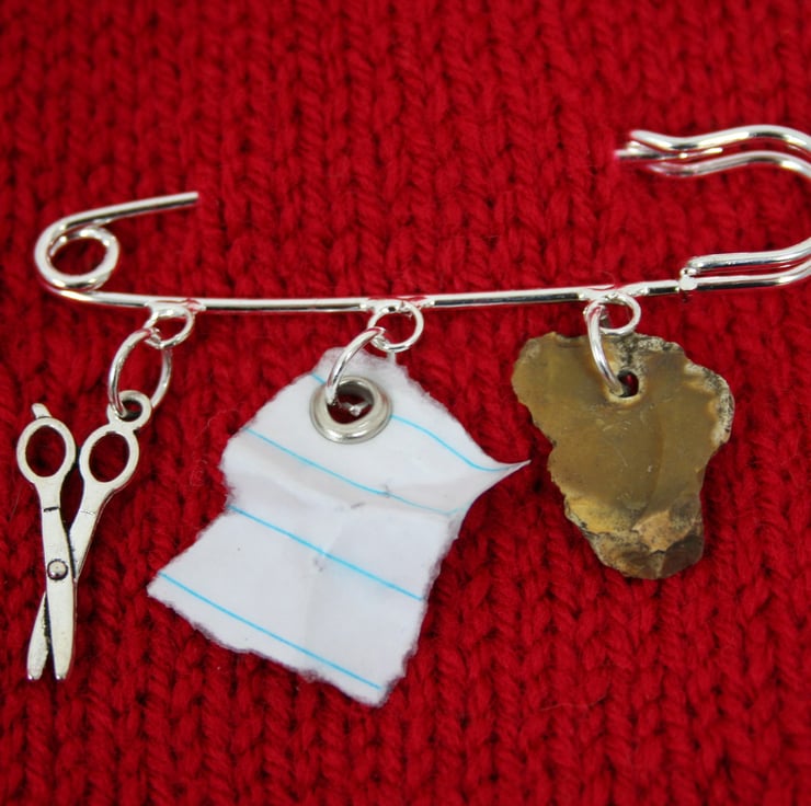 Every ‘scissors paper stone’ brooch is unique as the holey pebbles are found items. Each piece of paper is torn to size then coated in paper hardener so it preserved and semi-rigid. This silver-plated kilt pin is 70mm wide and is the larger version of this particular brooch design. Presented in a cute cardboard display box.