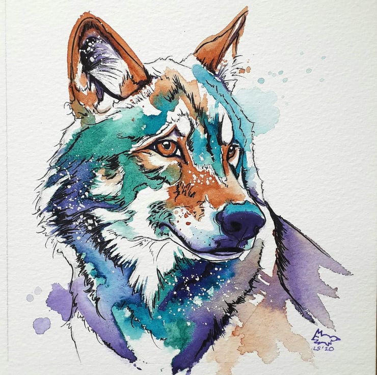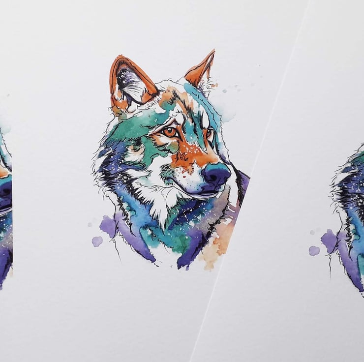 This is a print of my original wolf illustration, mounted and wrapped for protection. The whole mount size is 10x10 inches, with the image size being 7x7 inches. The image is printed on a slightly textured paper to resemble the watercolour paper of the original painting.