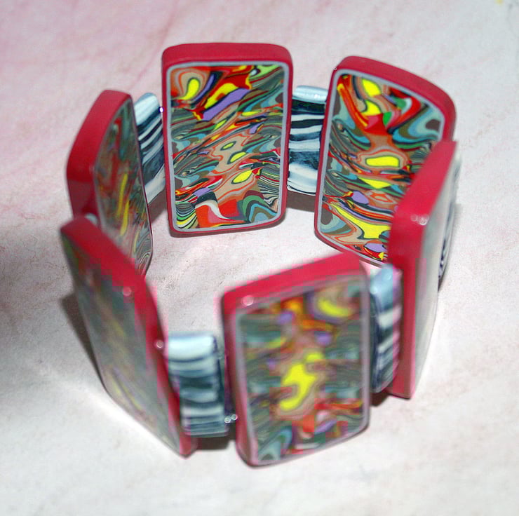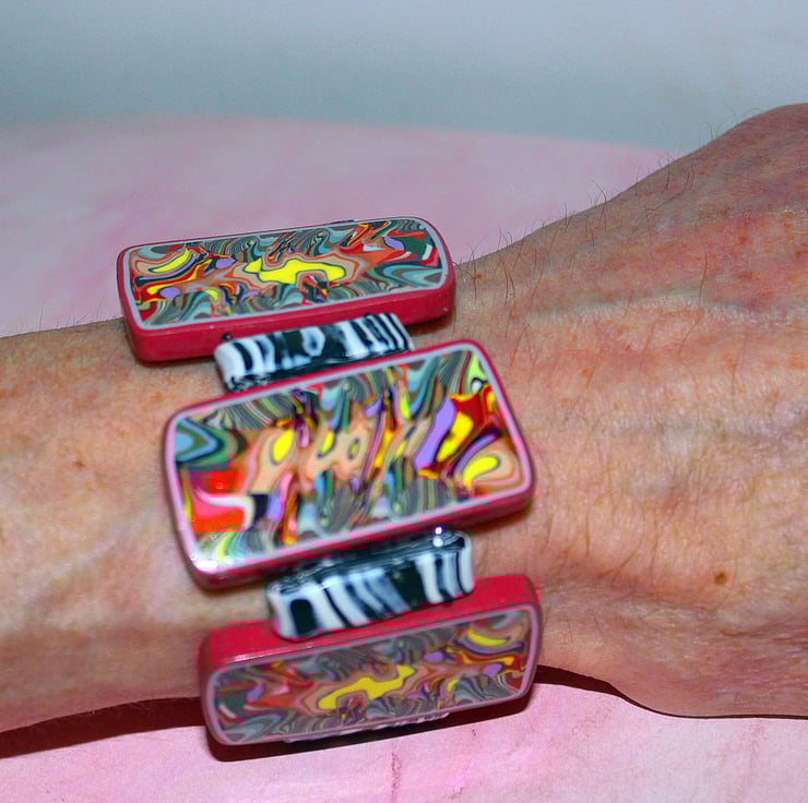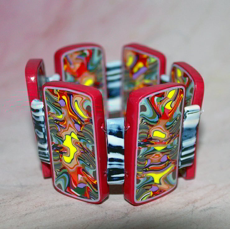 A very lively bracelet of loud and vibrant colors, not at all bashful!. The patterned tiles in swirling colors are crafted, by myself, from polymer clay.