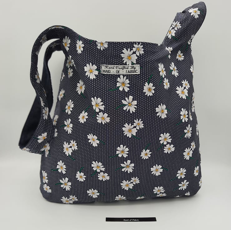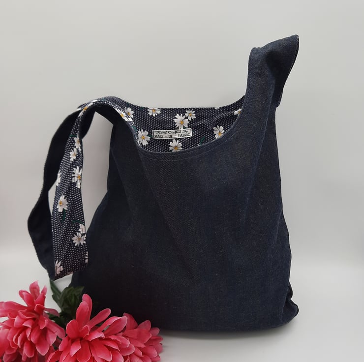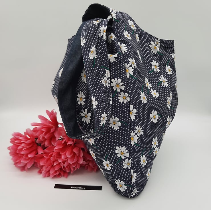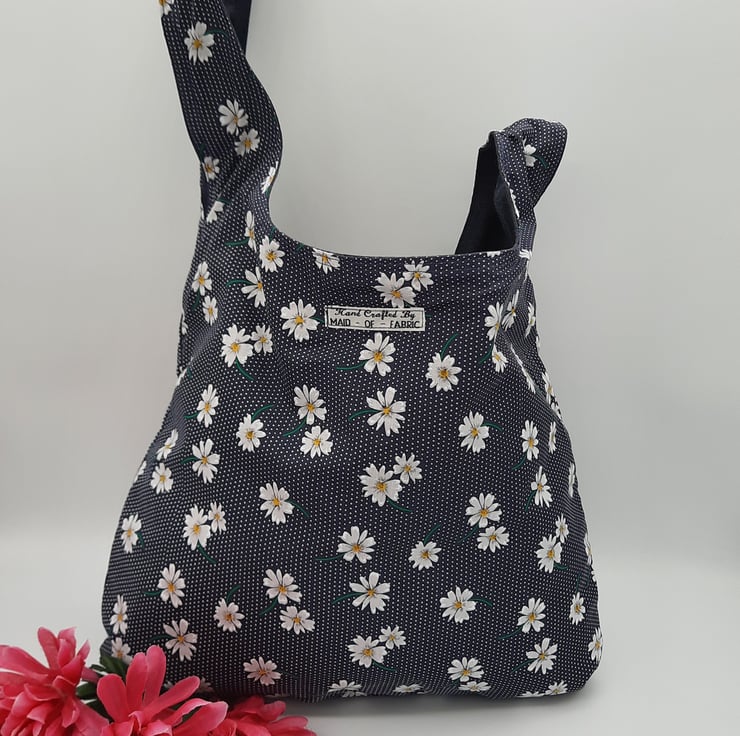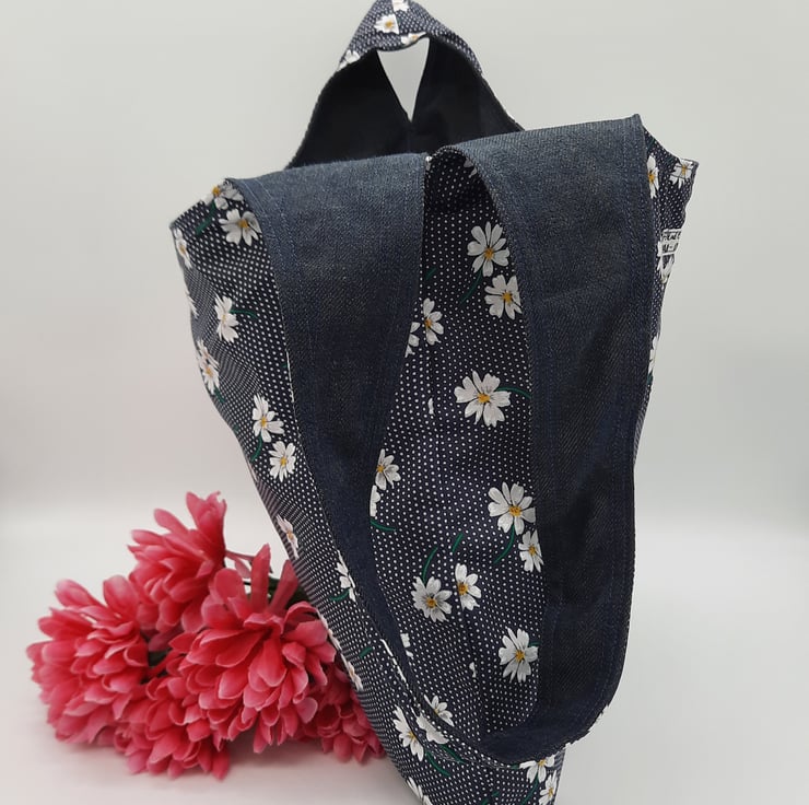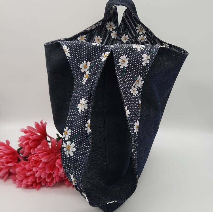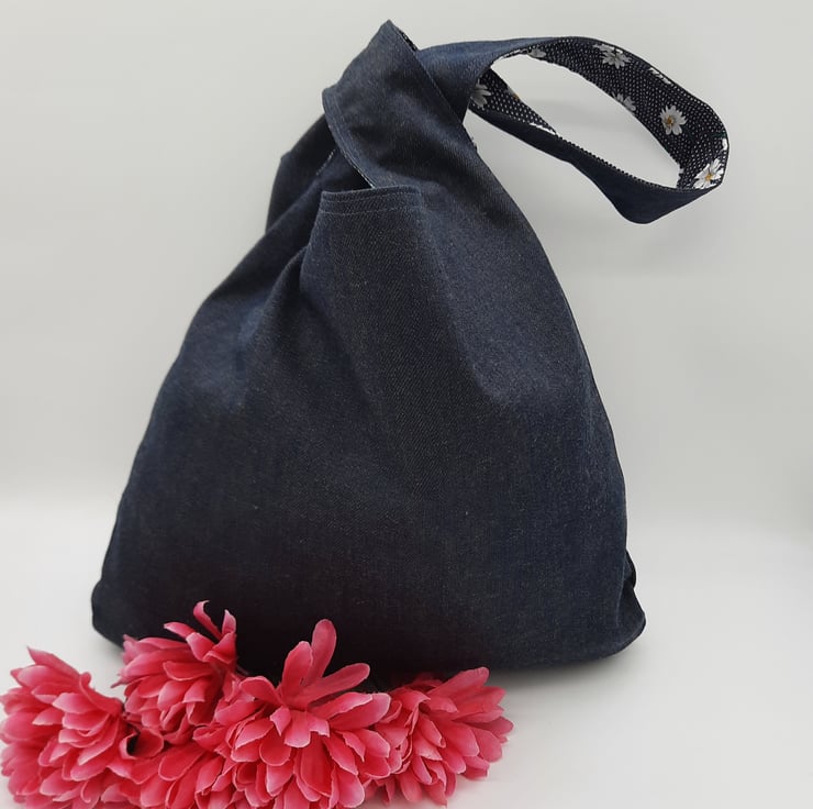Japanese knot bag made using a dark blue denim and a navy polkadot daisy print cotton fabric.
