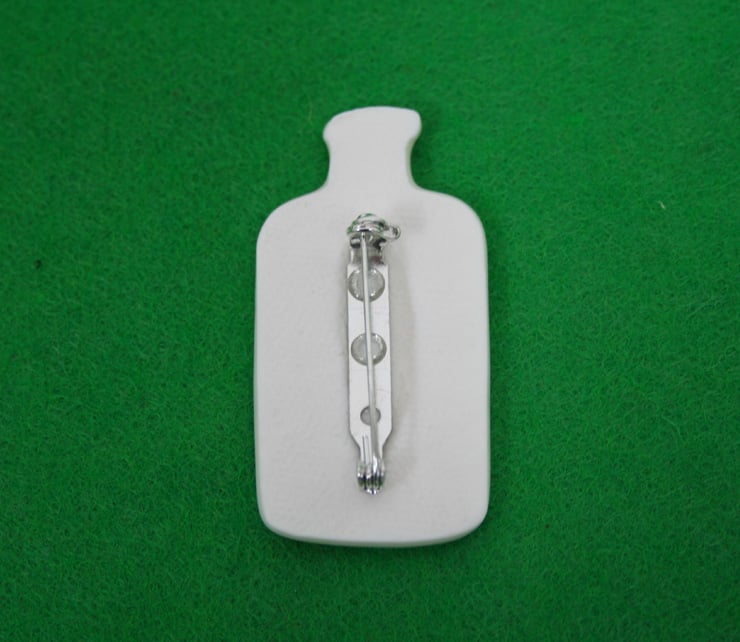 This small brooch is cut from a rolled sheet of clay around a template. It then goes through three firing processes including a high firing glaze. The brooch measures 5.5cm tall, 3cm wide and 3mm thick and is not glazed on the reverse. The ‘valium’ wording is a special ceramic transfer and is permanent. There is a brooch bar glued to the back. Presented in a cute cardboard box.