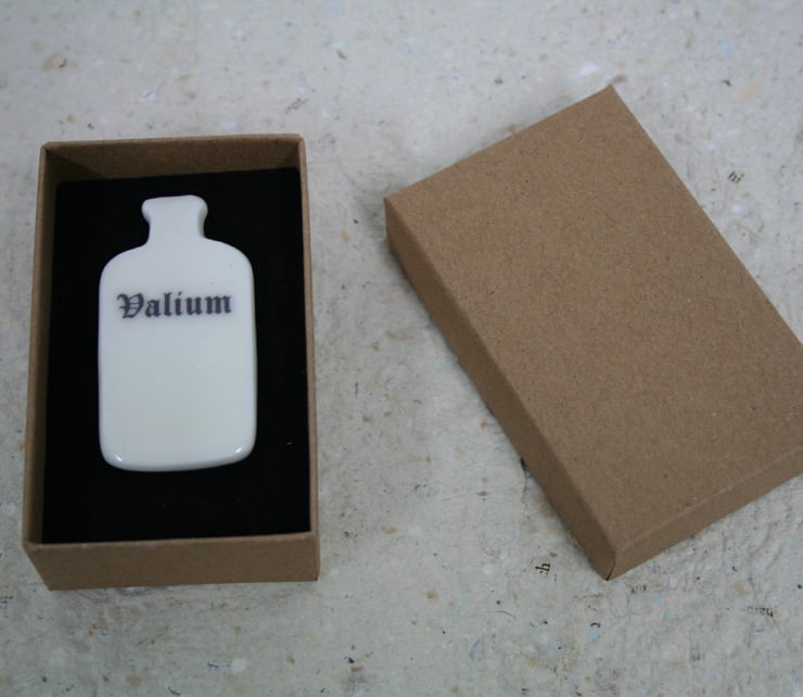 This small brooch is cut from a rolled sheet of clay around a template. It then goes through three firing processes including a high firing glaze. The brooch measures 5.5cm tall, 3cm wide and 3mm thick and is not glazed on the reverse. The ‘valium’ wording is a special ceramic transfer and is permanent. There is a brooch bar glued to the back. Presented in a cute cardboard box.