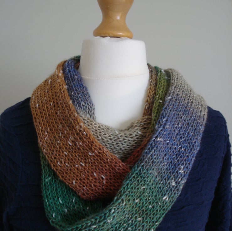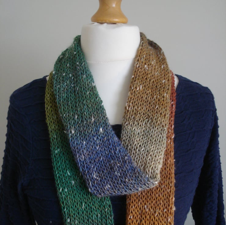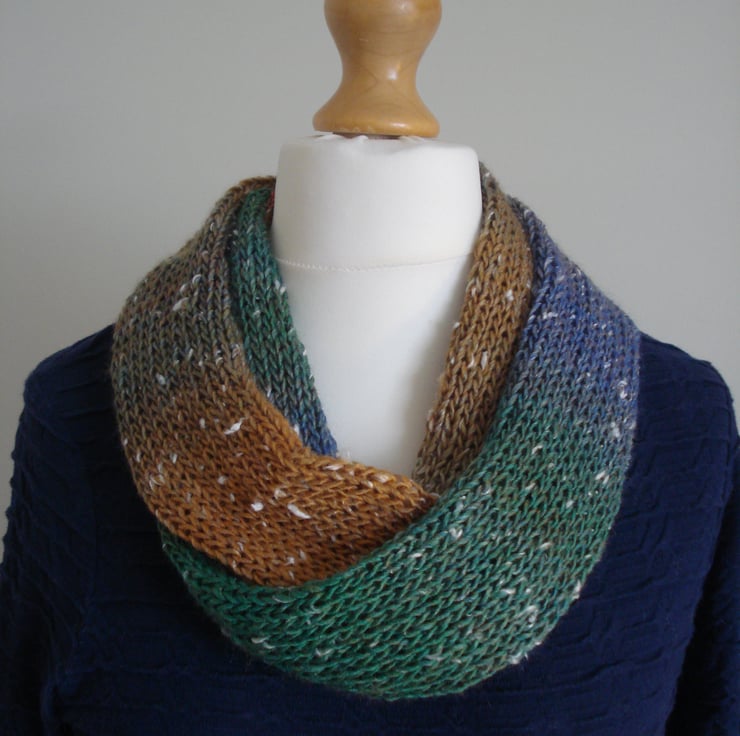 This knitted infinity scarf has been knitted from beautifully soft yarn in colours reminiscent of the Northern Lights. It is double thickness and extra long, so can be worn in many different ways to keep you really warm and cosy.