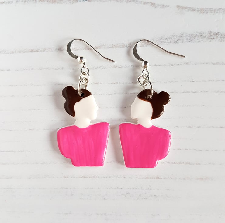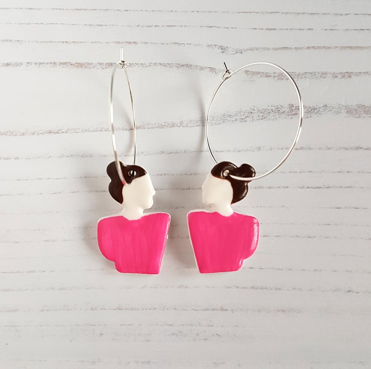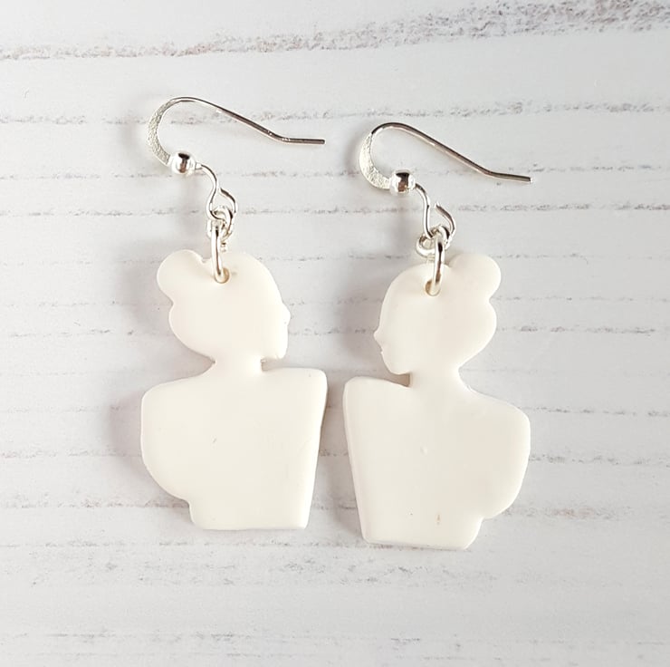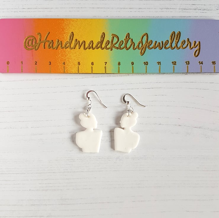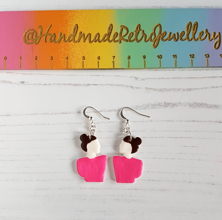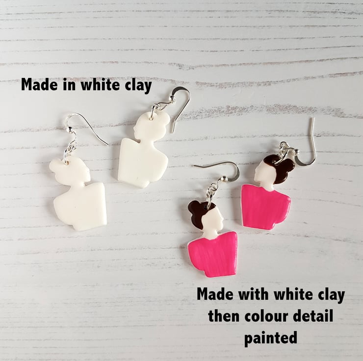 This listing is for a pair of gorgeous modern earrings, in the outline shape of a woman. The earrings are made to order, and can be made either in one solid colour clay of your choice, or have painted detail added for the hair colour and top colour; please choose your options from the variations in the drop down when purchasing.