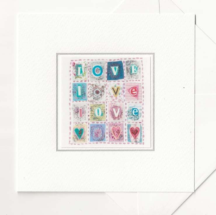 Beautiful hand crafted greetings card, with collaged paper and fabric squares, printed and hand finished with glitter, designed and created by the artist Suzanne Hooson. Perfect for a special someone.