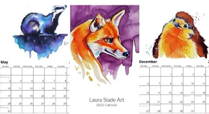 A4 sprial bound calendar featuring a selection of my wildlife art. One month per page of A4, half the page is artwork and ths bottom half has boxes for each day. Printed on high quality gloss paper.
