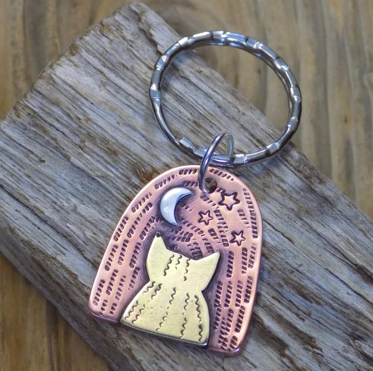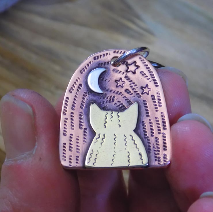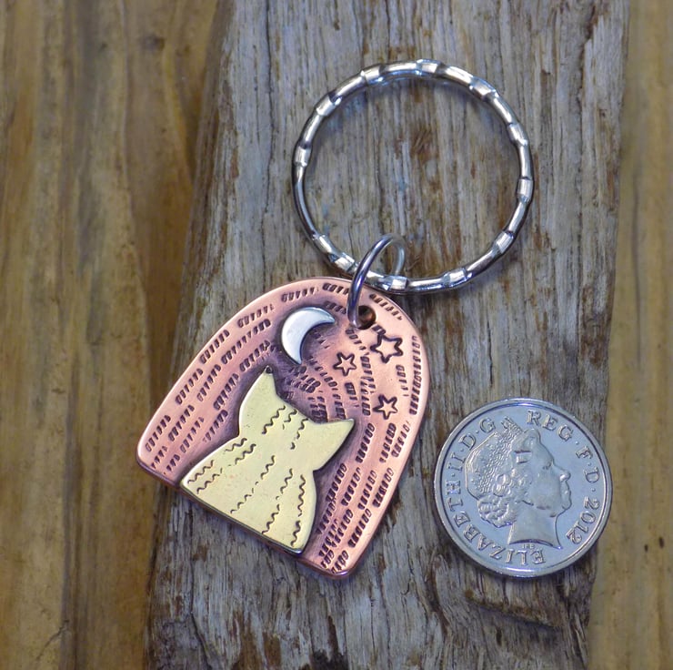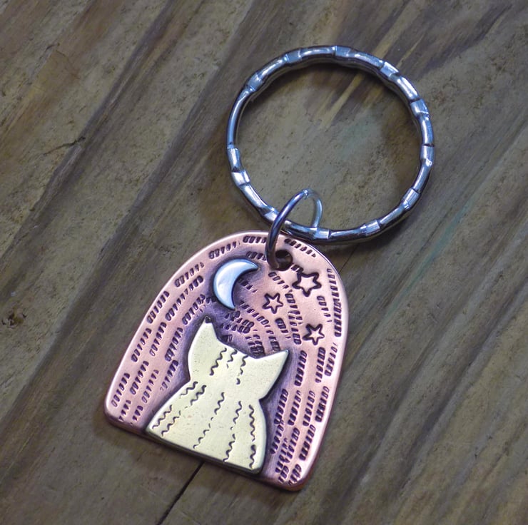 A little bit of fun for all those cat lovers! Simply made from thick 1.5 mm copper and a layer of brass and little silver. The cat silhouette has been carefully hand sawn and soldered to the front of the copper. He is looking to the stars and moon surrounded by a textured sky. Made even more special with the addition of a silver moon! Simply attached to a keyring with a sturdy jump ring. Given an aged appearance to show up the detail.
