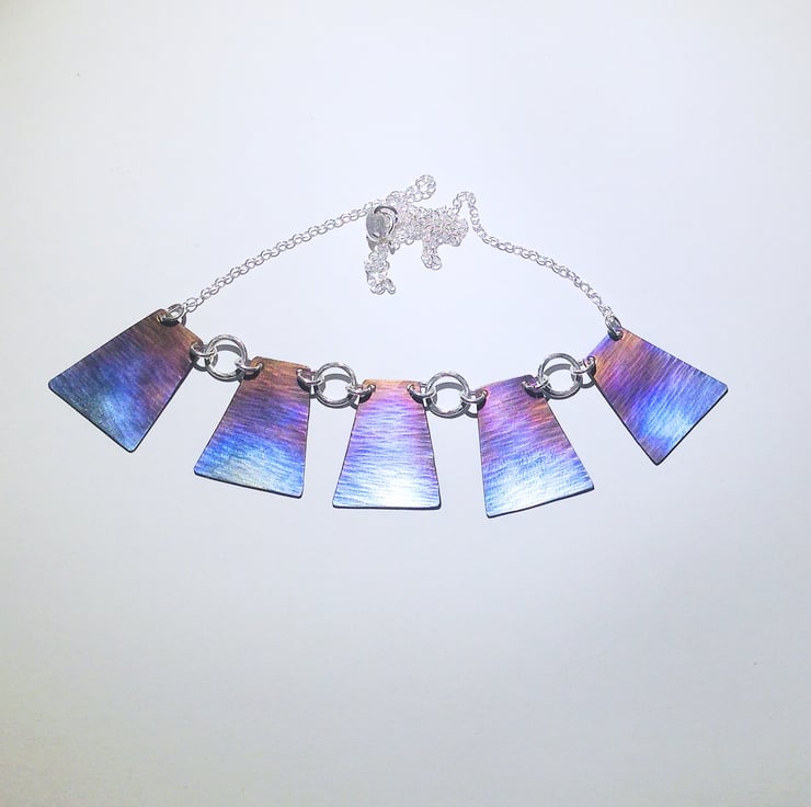 I have made this necklace by hand sawing the shapes from titanium sheet and have given the surface an attractive hammered finish before heat colouring. I have also made and soldered the sterling silver decorative rings and hammered them to create a contrasting texture. I have then constructed the necklace using sterling silver jump rings and sterling silver chain.