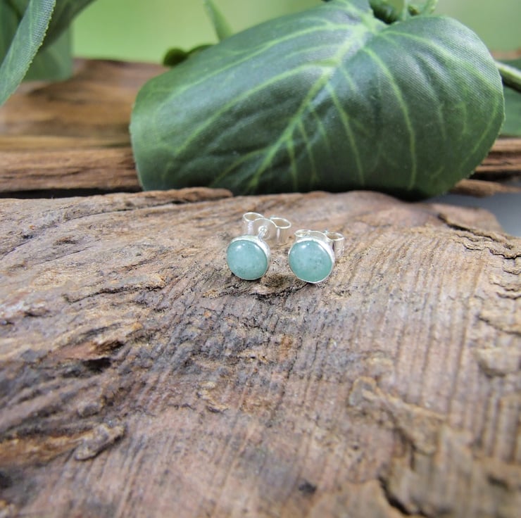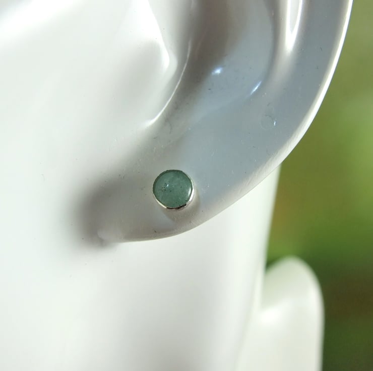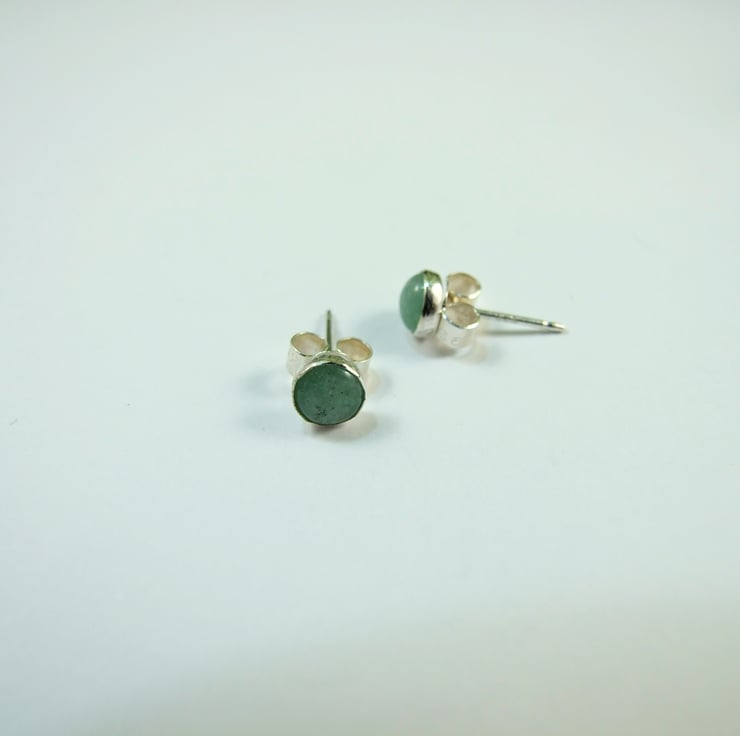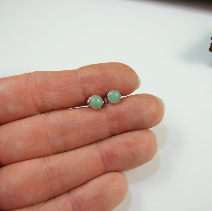 The dainty 5mm studs have been created from 5mm mint green aventurine cabachons set in sterling silver bezel. Studs have butterfly backs.