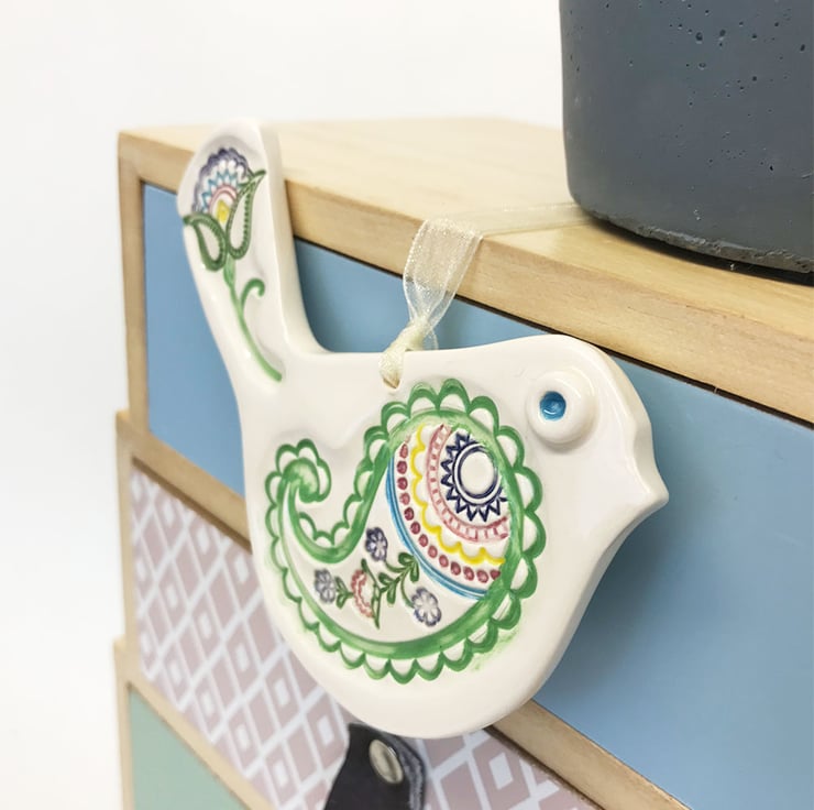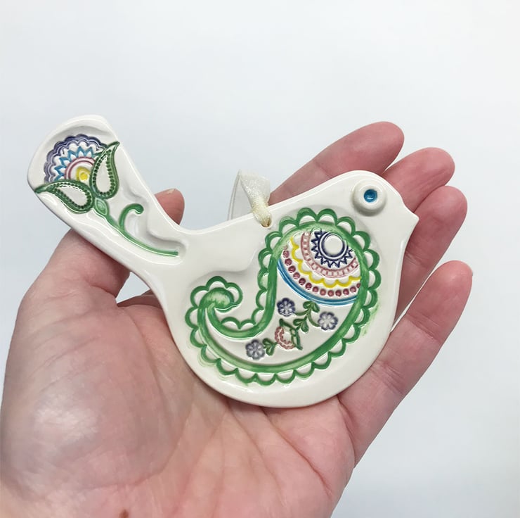 This cute little pottery bird has been hand-cut from white earthenware clay, decorated with colour and fired.
