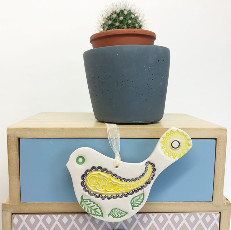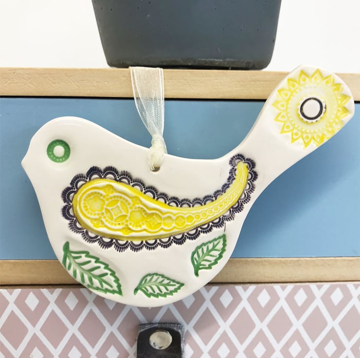 This cute little pottery bird has been hand-cut from white earthenware clay, decorated with colour and fired.