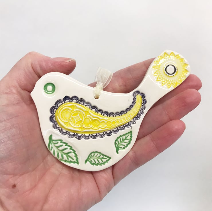 It has then been glazed with a lovely glossy clear glaze and fired again to 1100 degrees. It hangs from a cream organza ribbon. 10.5cm wide x 8cm high x 0.8cm deep.
