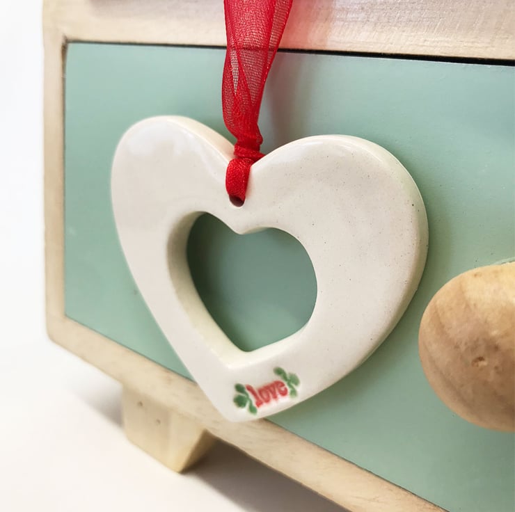 It has then been glazed with a lovely, glossy clear glaze and fired again to 1100 degrees. It hangs from a red organza ribbon. 6cm wide x 5.5cm high x 0.8cm deep. Please note; This heart is cream but it looks white in the photographs