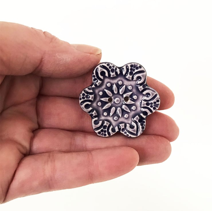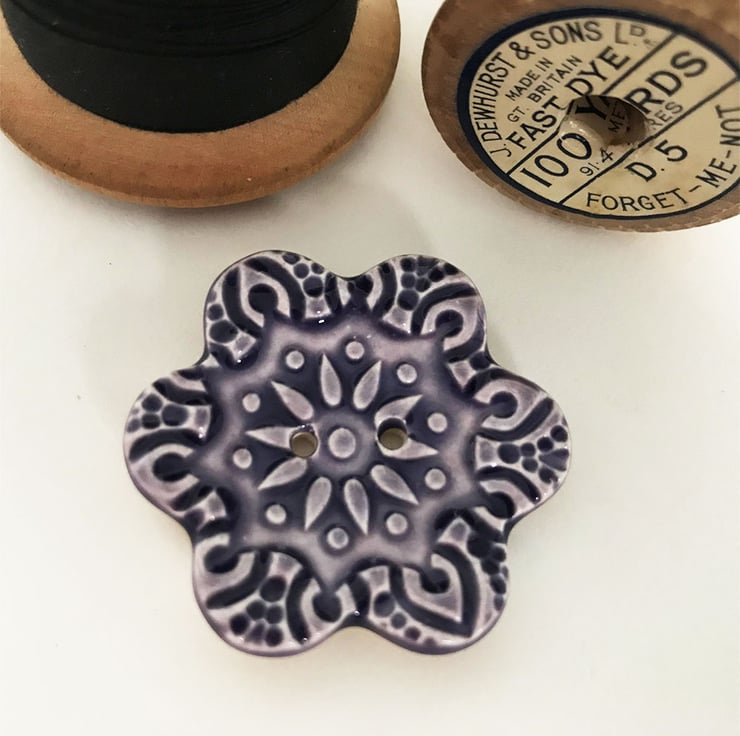 This large pottery button is made from white earthenware clay, embossed and glazed on the front. It is then fired to 1100 degrees, so nice and strong. It measures 4cm x 3.5cm.They can be handwashed or machine washed on a low temperature. Perfect for all sorts of arts and craft projects.