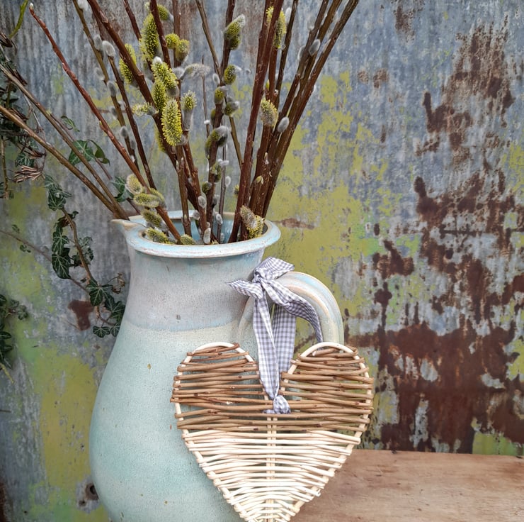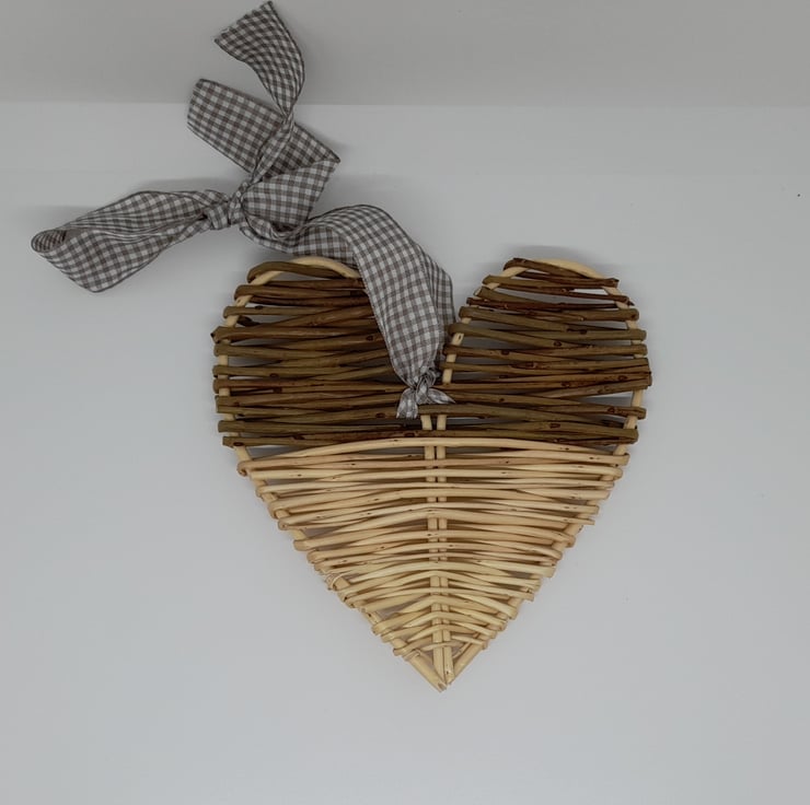 White & brown block willow heart with beige gingham ribbon.