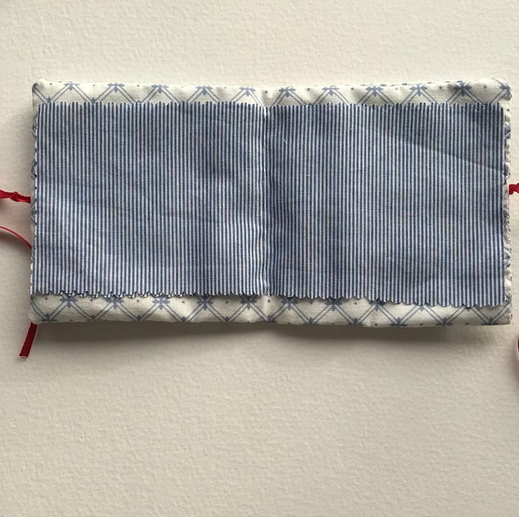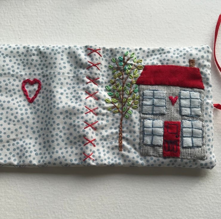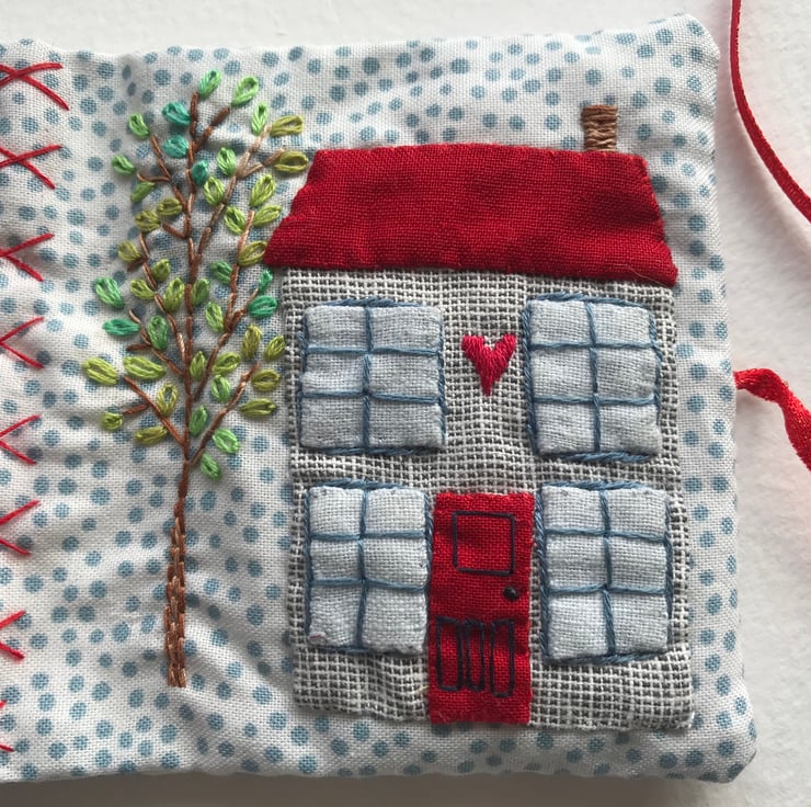 I have designed and hand sewn this needle case. It is made from cotton and has 4 cotton pages to hold needles. It features a folk art appliqué house and embroidered tree. There are 2 ribbons to tie it closed. It is padded between the front and inside covers.